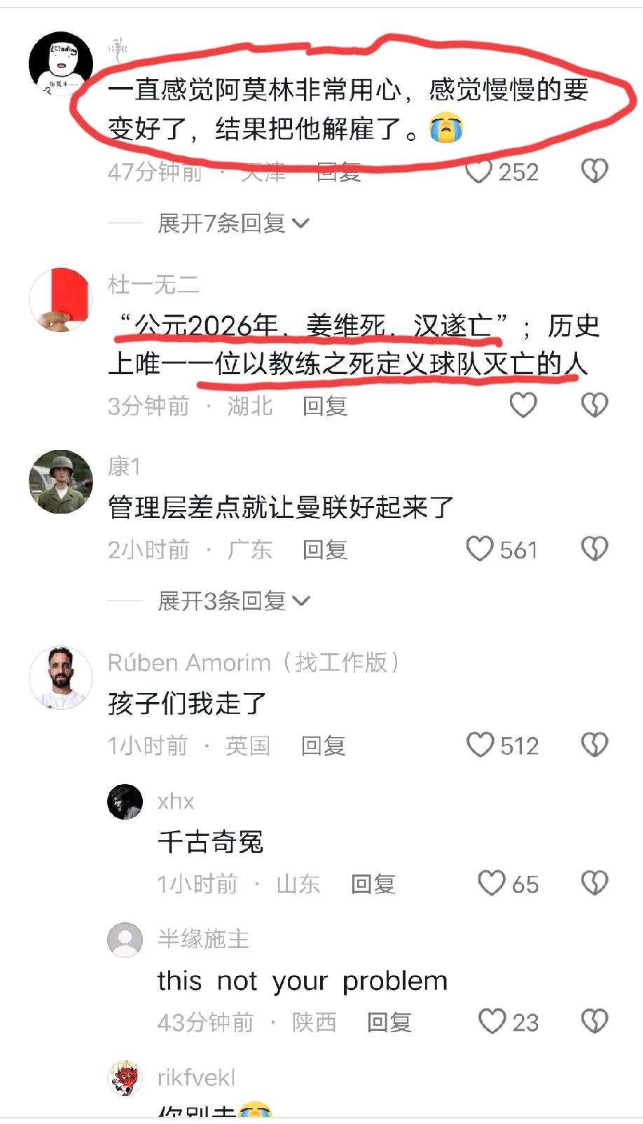 曼联毫无征兆的解雇主教练阿莫林,国内球迷都懵逼了,都纷纷表示看不懂曼联管理层的这番骚操作:“刚好起来点又开始了,要不当初垫底的时候你就炒掉啊”。 更有网友用一句古话形容曼联的这个决定是大错特错:“姜维死,汉遂亡”。 评论区又喊出“千古奇冤阿莫林”的呼声。 …… 有没有可能,阿莫林跟管理层的矛盾已经由来已久,昨天的赛后发布会又怒喷管理层,管理层也是忍无可忍了,可能这也是阿莫林想看到的,毕竟可以拿到高额的解约金。
