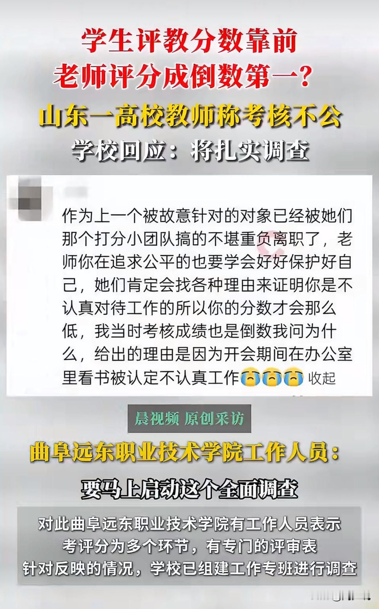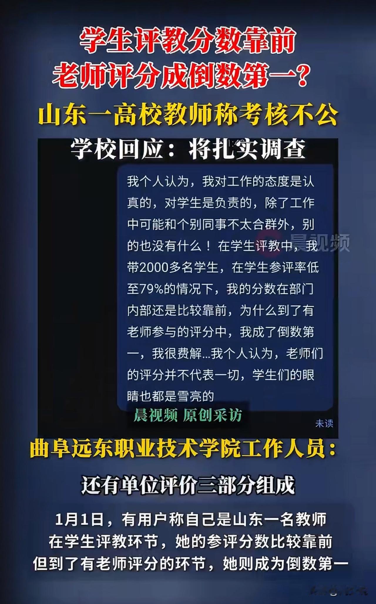 “真是意难平啊!”山东一位高校教师明明教学能力被学生认可,名列前茅,没想到到了教师互评环节,竟成了倒数第一。这种遭遇让其忍不住在社交平台发文质疑不公,要求校方给出具体评分依据。 对于这样的情况,学校回应称:考评分学生评教、教师互评、单位评价三部分,已组建专班调查,还不排除有网友带节奏。 此事曝光后,不少网友纷纷表示:“学生的认可才是最硬核的标准,同事互评水太深!” 在周少看来,这位老师确实意难平,公开质疑也没有任何问题。而且,这场考核争议,其实凸显了高校评价体系的一个痛点。 学生评教直接反映教学效果,本应占据核心权重,可教师互评一旦掺杂私心、人脉等因素,就容易偏离“以教学为本”的初衷。 客观的说,教育的根本是教书育人,评价老师的尺子,理应向学生的真实反馈倾斜,而非让人情世故左右结果。 只有让考核标准更透明、更公正,才能让潜心教学的老师不寒心,也才能真正守住教育的初心。若任由不合理的考核机制消耗教师热情,最终受损的,还是千千万万的学生。#寻美三湘# #长沙新朋友#