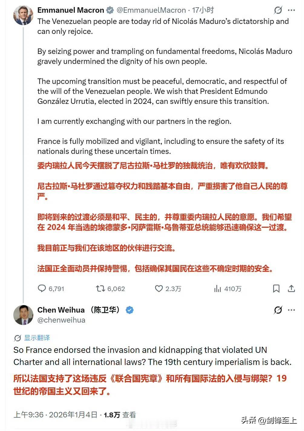 马克龙和法国人民为敌,看来也是不想干了 就在马克龙公开支持美国绑架马杜罗后 老革命基地巴黎就爆发了规模庞大的反美游行 “特朗普,滚开!加拉加斯,不是你的” 瞅瞅,法国人民这觉悟,和资本家有本质区别