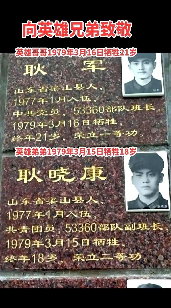 弟弟3月15号牺牲。 哥哥3月16号,第二天,也牺牲了。 亲兄弟俩。 我每次看到这个故事,都不知道该怎么形容心里那股劲儿,太堵了。 1977年,也是同一天,哥俩一块儿从山东梁山入的伍。 你可以想象吗?一个妈生的俩儿子,高高兴兴,穿着新军装,胸戴大红花,在全村人的羡慕里,一块儿走的。 多光荣啊。 可爹妈怎么也想不到,两年后,等来的是什么。 是前后脚送来的两份阵亡通知书。 就隔了一天。 昨天刚为弟弟哭到肝肠寸断,今天哥哥牺牲的消息又砸下来了。 我不敢想,真的不敢想,那个家,那对父母,是怎么熬过来的。 天就那么塌了,塌得彻彻底底,连块瓦片都没剩下。 我们现在很多人,可能都不知道耿军、耿晓康是谁。 没关系。 但你要知道,我们今天能安稳地坐在这里,刷着手机,抱怨着生活里的鸡毛蒜皮…… 是因为当年,有无数个这样的“昨天”和“今天”,有无数对再也没能一起回家的亲兄弟。 他们从梁山好汉的故乡走出来,成了真好汉。 只是,再也回不去了。