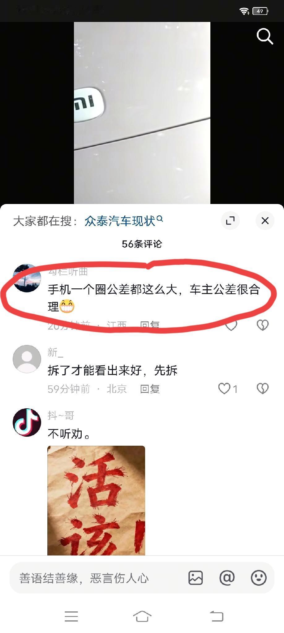 网友发视频吐槽:路遇粗粮小车,原来网上传的是真的…… 视频显示:前面两个大灯,其中一边的那条线跟机盖这里是对准的,另外一边就没有对准,很明显的看出有高低。 评论区网友调侃道: 手机变焦环这么一个小圈公差都这么大,车子大灯这么大一个件公差这么点非常合理! 话说前几天不是直播拆车了吗,这种细微处应该是展示不出来的吧?