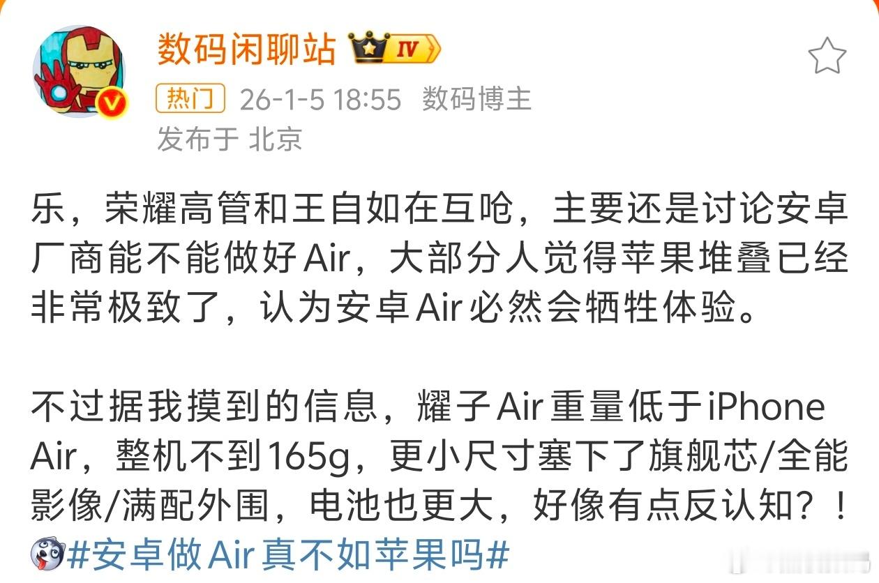 安卓做Air真不如苹果吗王自如还是太片面,直接以批判的眼光对待整个安卓,整和供应链并不是只有苹果可以,安卓也不是完全没有研发和创新。战哥也说了耀子还是有东西的。