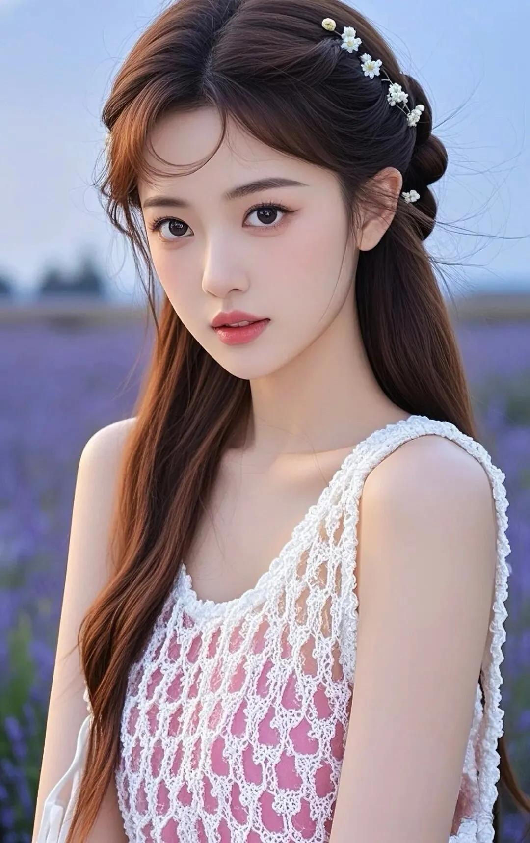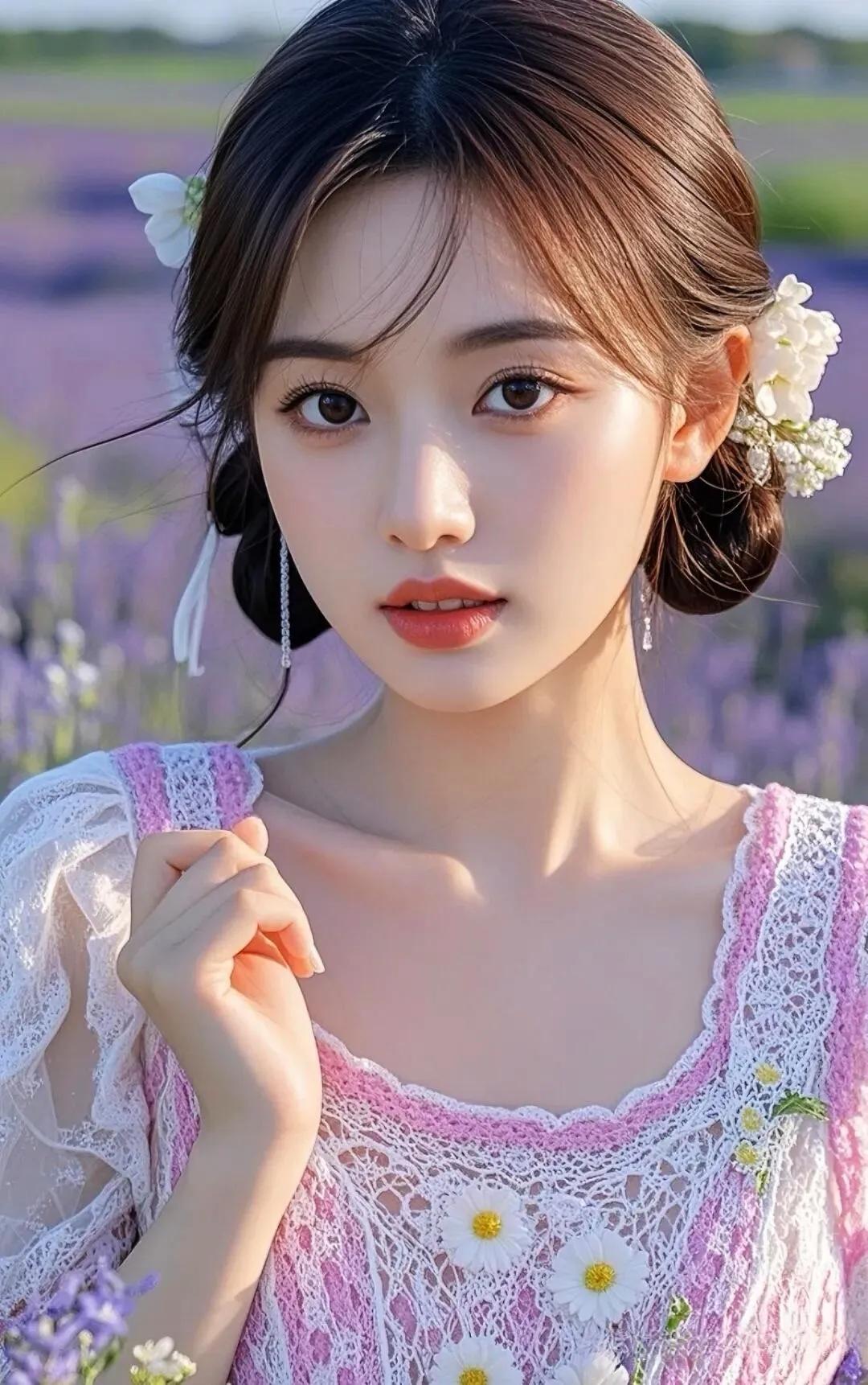 粉裙少女与花海,鸟儿相随,唯美如画。
