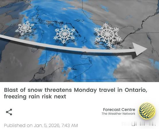 环境部预警: 多伦多明早冻雨连下数小时+2mm冰层! 今早,大多伦多地区(GTA)部分区域一度发布黄色降雪警告,全天降雪量最高可达10厘米。 今天中午11点多,环境部将多伦多的黄色降雪警告更新成了灰色特殊天气预警:从周二早上到下午,预计将出现持续数小时的冻雨,局部地区可能形成1至2毫米的结冰(或冰层累积)。 环境部称,在冻雨过程中,降水有时可能夹杂降雪或冰粒。随着气温升至冰点以上,降水预计将逐渐转为普通降雨。 活跃的天气形势还将持续。本周后半段预计还有两套系统影响安省南部。 周五首先到来的一套系统将带来大范围降雨,气温回升至个位数高温(接近10°C)。该系统来自美国南部,暖空气明显。 周六的第二套系统则可能再次带来雨雪混合天气,并伴随较强风力,整体影响程度也可能更大。