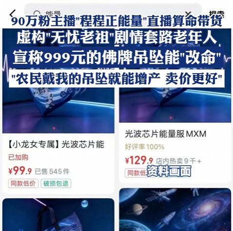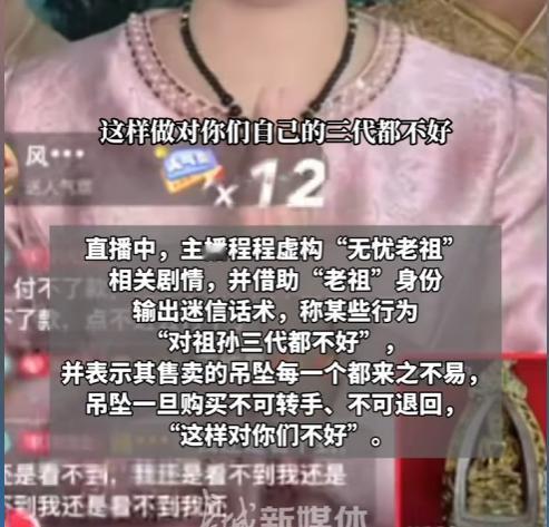 把迷信包装成 “正能量”,把老人当成提款机。主播程程这波操作,恶毒又嚣张。 直播间里,她编出 “无忧老祖” 的虚假剧情,对着镜头忽悠老年人:戴 999 元佛牌能改命,农民戴了玉米都能多收多卖。暖心话术拉近距离,迷信洗脑降低防备,再用饥饿营销制造恐慌,暗示能看到购物车链接就是 “老祖选中的幸运儿”,催着老人仓促下单。 更可恶的是,她搞起账号矩阵,自己运营多个账号,还联动丈夫 “刘先生” 的账号卖高价 “能量产品”。2980 元一瓶的 “生命能量种子”,直播价只要 99.9 元,差价超 29 倍;所谓 “光波能量服”,包装全是乱码,食品许可证编号查无此人。 90 万粉丝里,不少老人被深度洗脑,把佛牌当护身符,偷偷买能量产品,家属怎么劝都不听。律师早已指出这是虚假宣传和消费欺诈,可相关账号仍在正常运营。 迷信骗局专盯老人软肋,平台别再装聋作哑! 早一天清剿,就少一批老人被骗走养老钱。