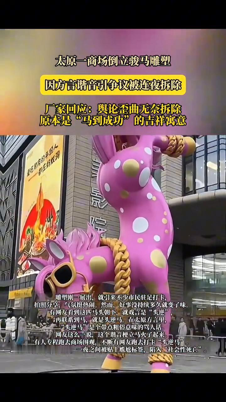 商场倒立骏马雕塑因方言谐音引争议被连夜拆除。厂家回应:舆论歪曲无奈拆除。 原本是"马到成功"的吉祥寓意。据媒体报道,2026年元具,太原北美新天地商场门出现了一尊粉色倒立马雕型。马儿头朝下,四蹄朝天,还戴着一副墨镜,造型搞怪又醒目。设计初表借"倒"请音"马到",寓意"马到成功。马上有钱",为即将到来的农历马年讨个喜庆彩头,也给商场拉点人气。 雕塑南展出,就引来不少市民驻足打卡,拍照分享,"氛挺热闹,然血,好事没持续多久就变了味。有网友看到这匹马头朝下,就戏言是"头逆",再联系到马,就是头逆马。在太原方言里,"头逆马"是个带点粗俗意味的骂人话。 二网友这么一说,这个晴音梗立马火了起来。一有人专程跑去商场观,"不断有网友跑去打卡"头逆马"。原本高意吉祥的唯塑,一夜之间被贴上尬标签,陷入"社会性死亡"。 1月3日夜里,这四潮刚展示了三天的雕塑就被拆除了,话题"太原商场马年雕塑连夜拆除"也冲上了热搜。有人致电商场客服询问雕塑拆除的原因,对方回应称是"不可抗力因素,影响不好"。