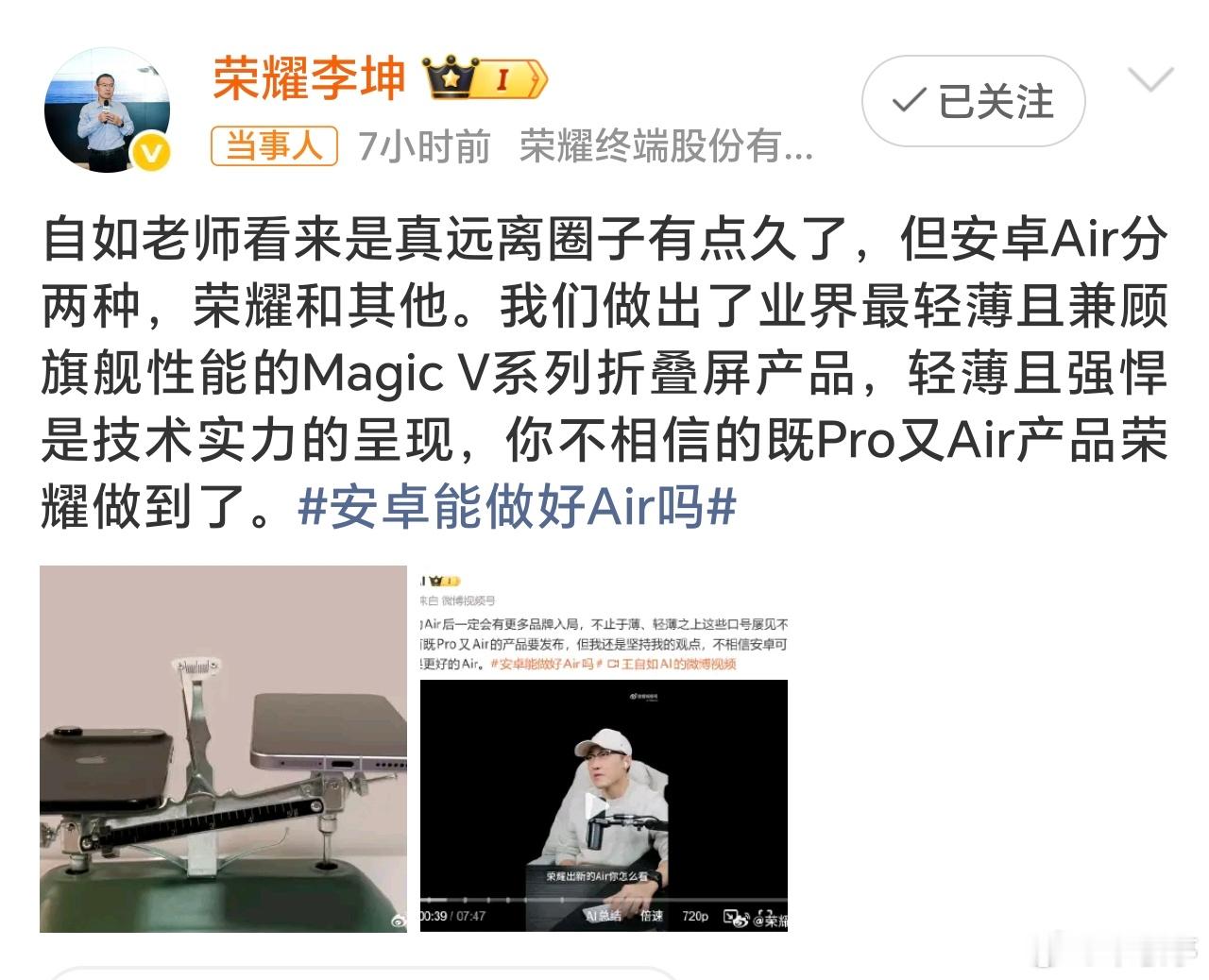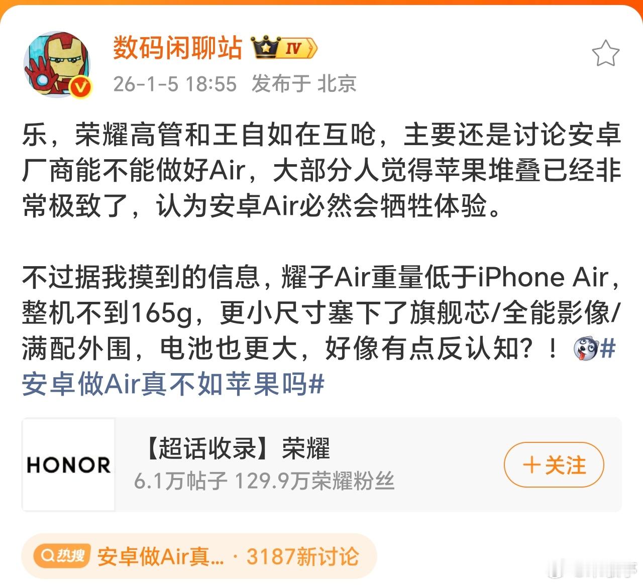 王自如确实离开机圈久了,这次荣耀Air确实有东西,比iPhone Air更轻、电池更大、旗舰芯、满配外围,全能影像。大家发现没?荣耀近一段时间打造的产品确实款款强大,定没极准啊!