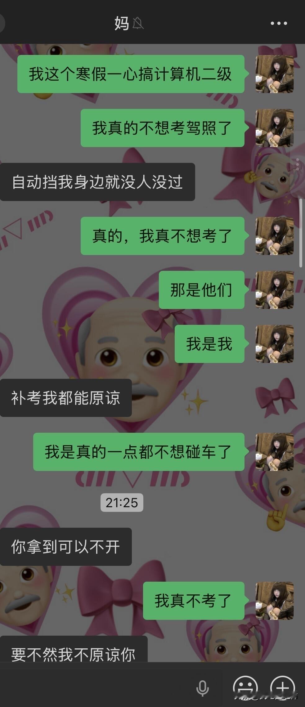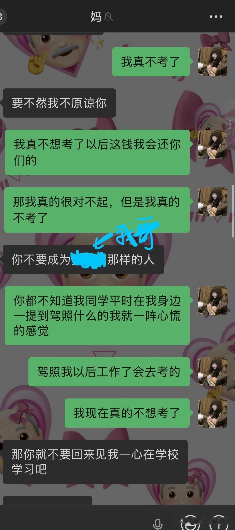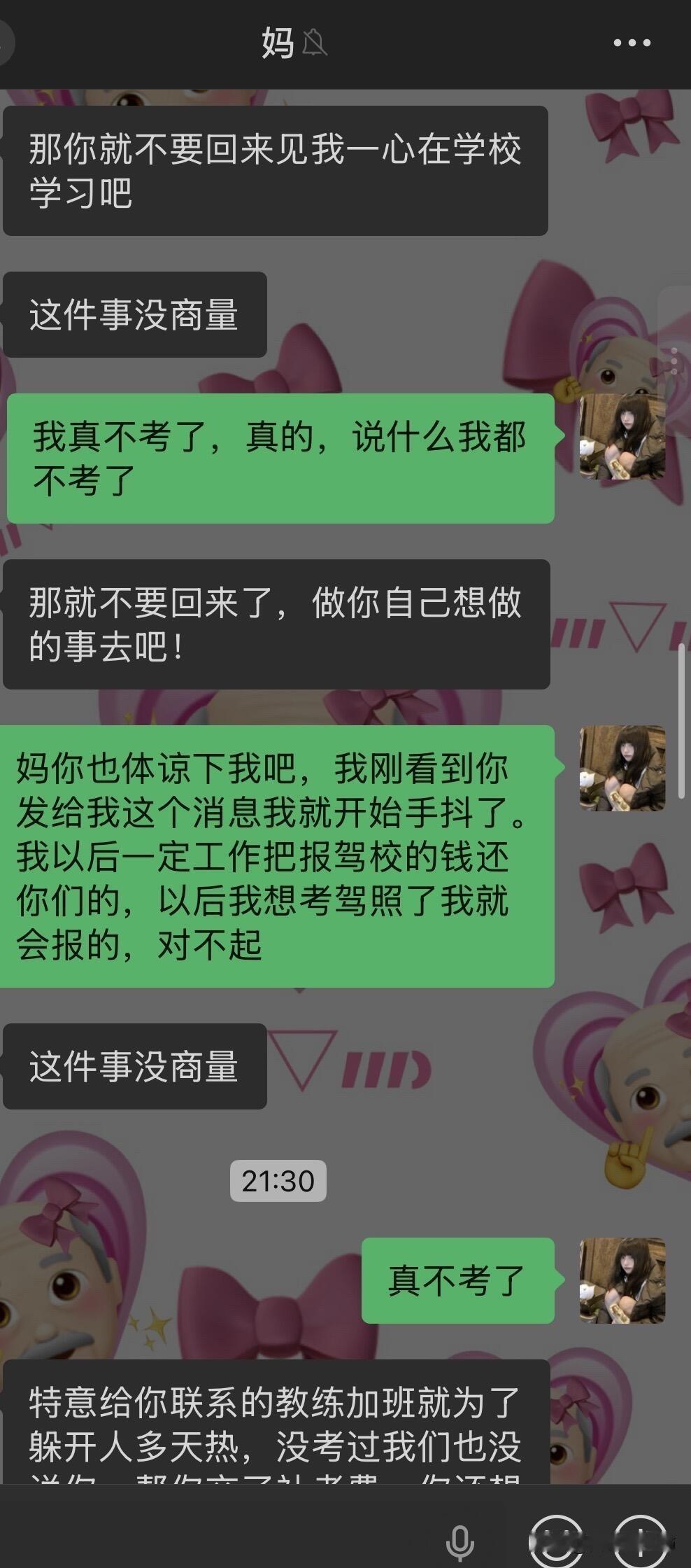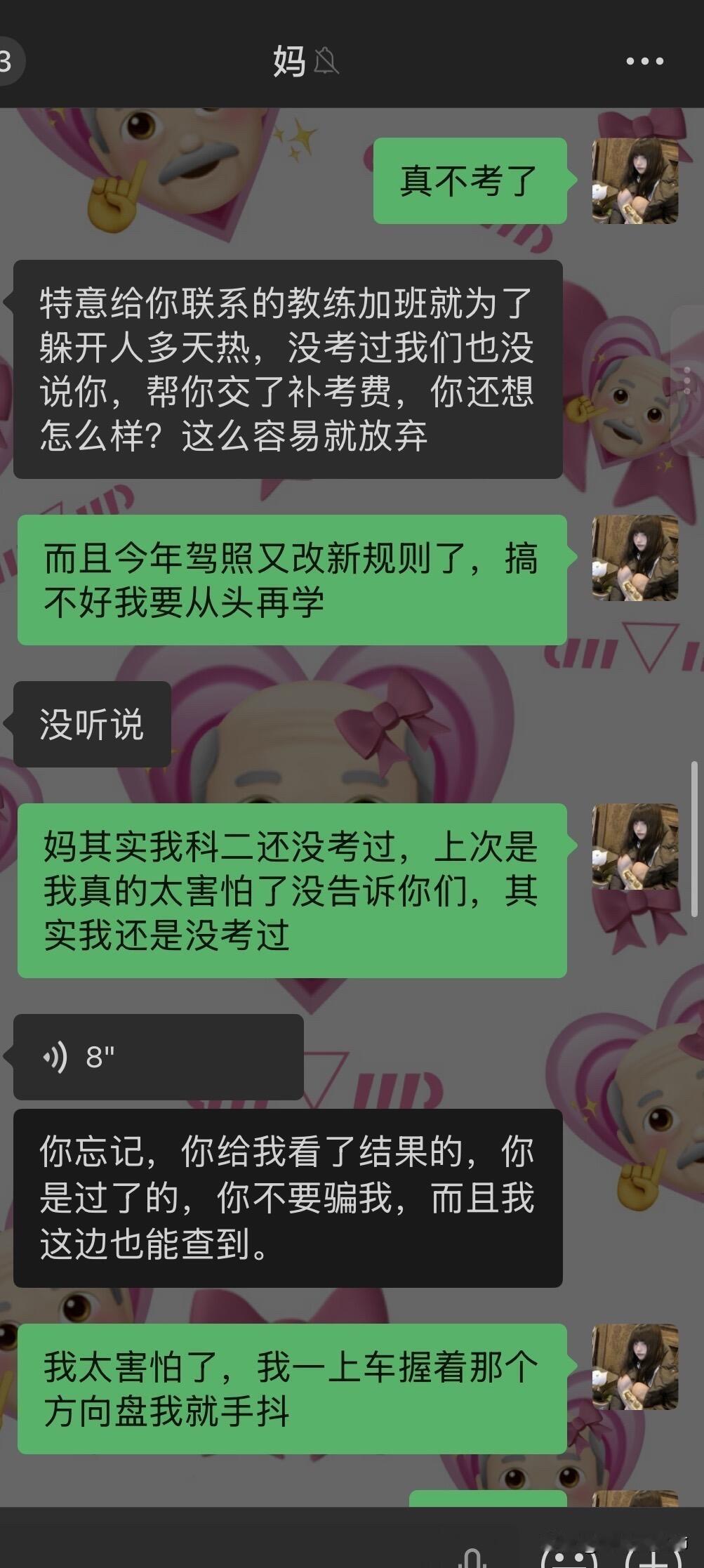 因为驾照跟我妈闹翻了…… 我从高考后就每天都被我爸妈从早到晚的催着去学驾照,他们说我小时候开卡丁车很厉害学车肯定也很简单。我就听信了他们的话去驾校学车,可是科二挂了3次还是没过,其实第二次没过的时候我已经很厌恶开车了,我不懂为什么每次在驾校练的好好的教练都说我一定能过一去考场就挂。而且第一次和第二次没过,我回家后我妈都很失望的看着我然后嘲讽我好多天。第三次我太害怕了,我就把我的分数p了,告诉我爸妈我过了,我就先去学科三了,我想着网上都说科三过了科二就很简单了,但是学了科三后,依旧是教练说我没问题,但还是挂了。 我现在真的是一点都不夸张,说起考驾照我就手抖心慌起冷汗,本来在学校就想着回家就跟爸妈说不考了,好好商量,我妈今晚突然跟我提了这事我就只能讲了,就有了如图的对话……她把我删了 关于我哥,不知道为什么我妈处处都看不惯我哥(我二姑的儿子),我哥做不到的她就一定要求我得做到。但我这次真的不考了,感觉考驾照已经是我的梦魇了。 现在看来我妈是绝对不允许我回家了,请问一下各位网友我该怎么办呢,寒假留校找点家教做吗