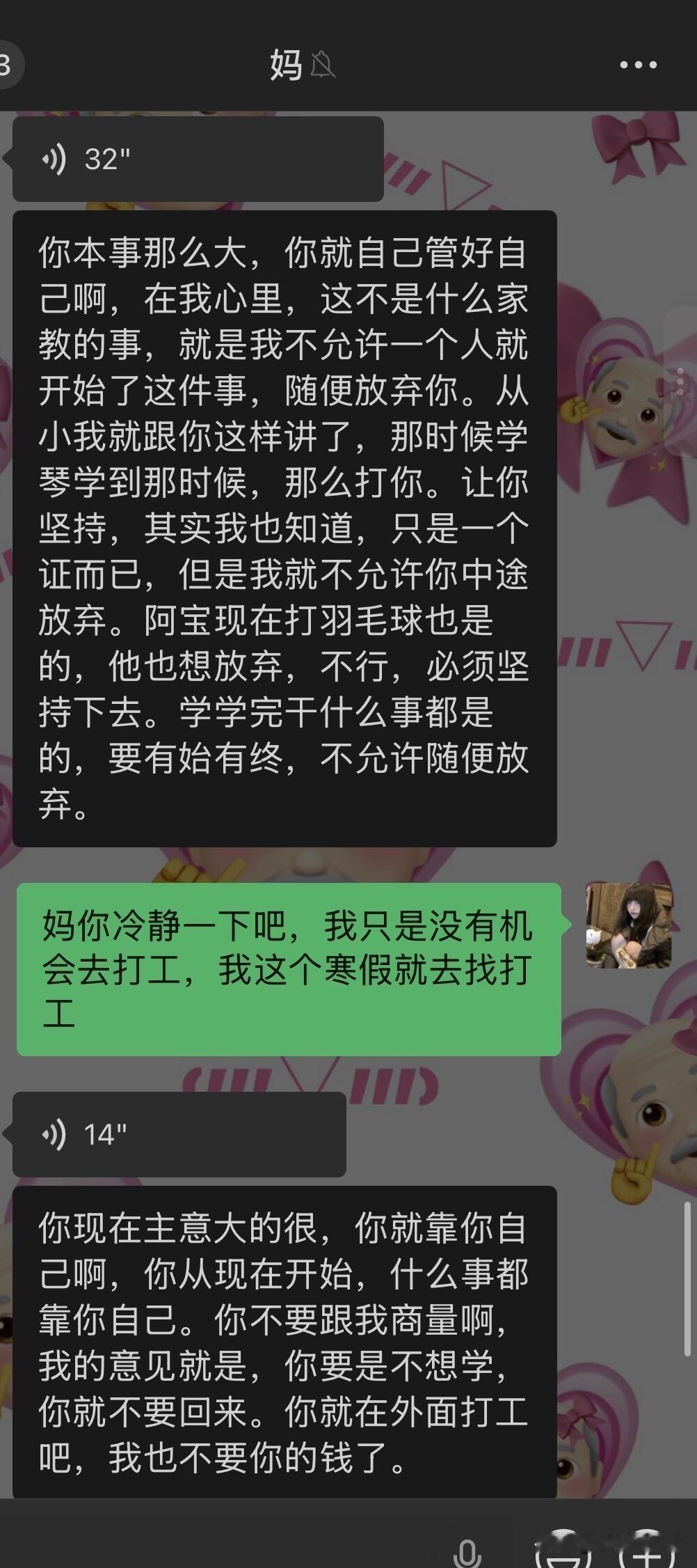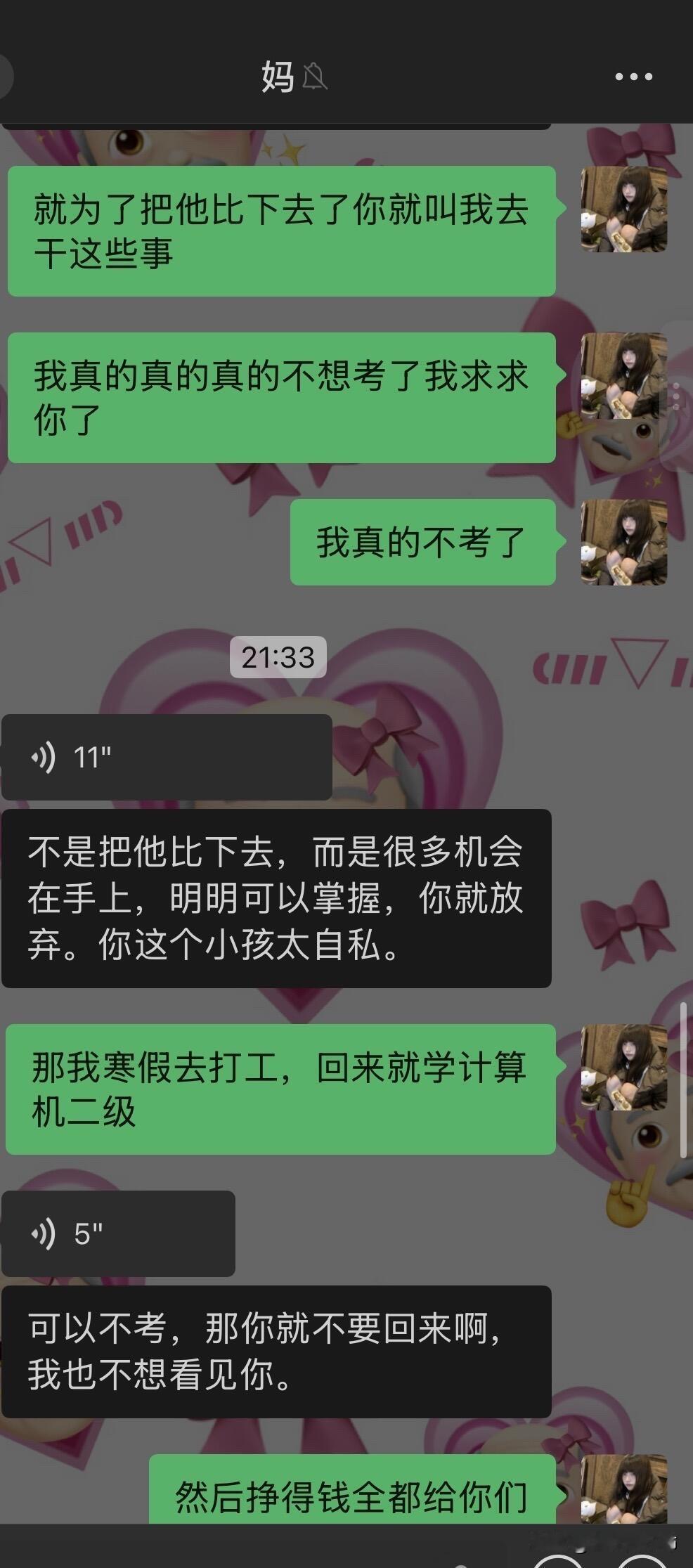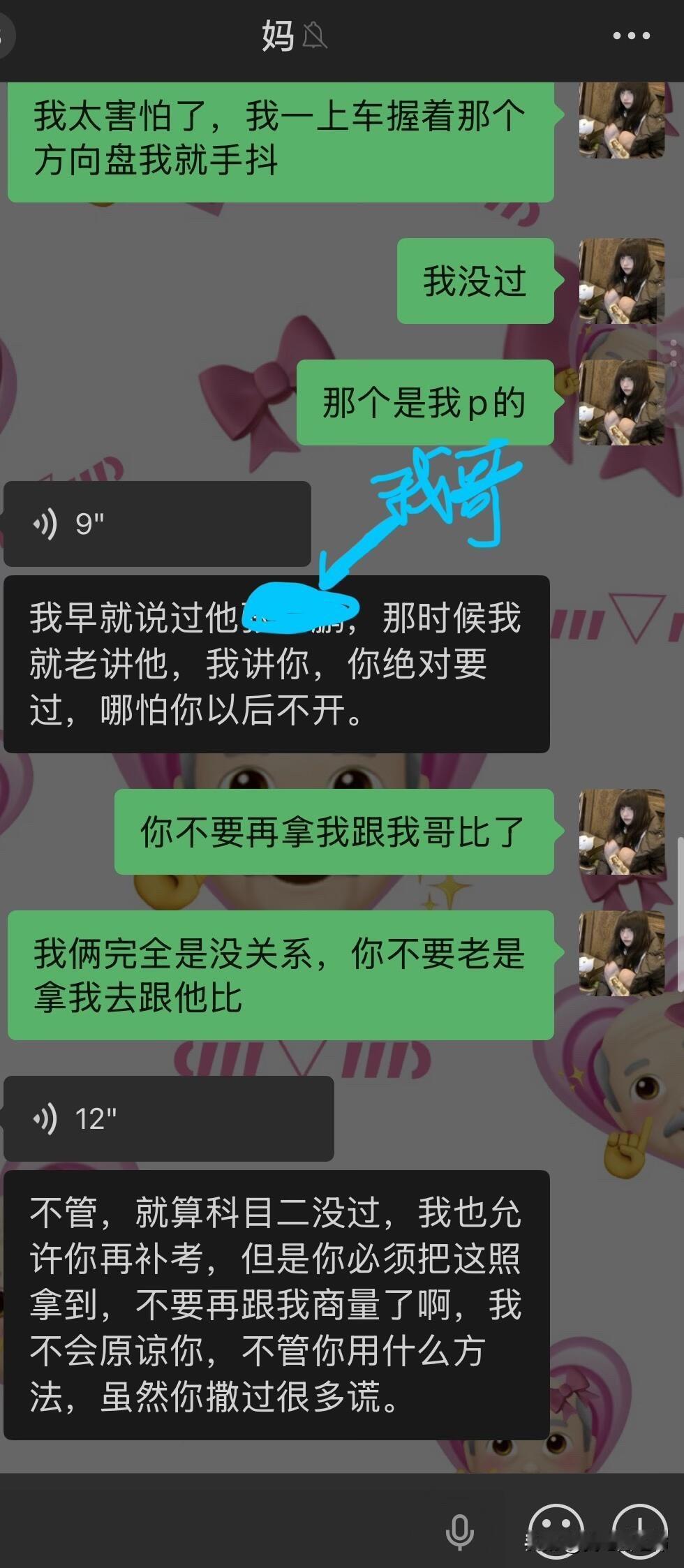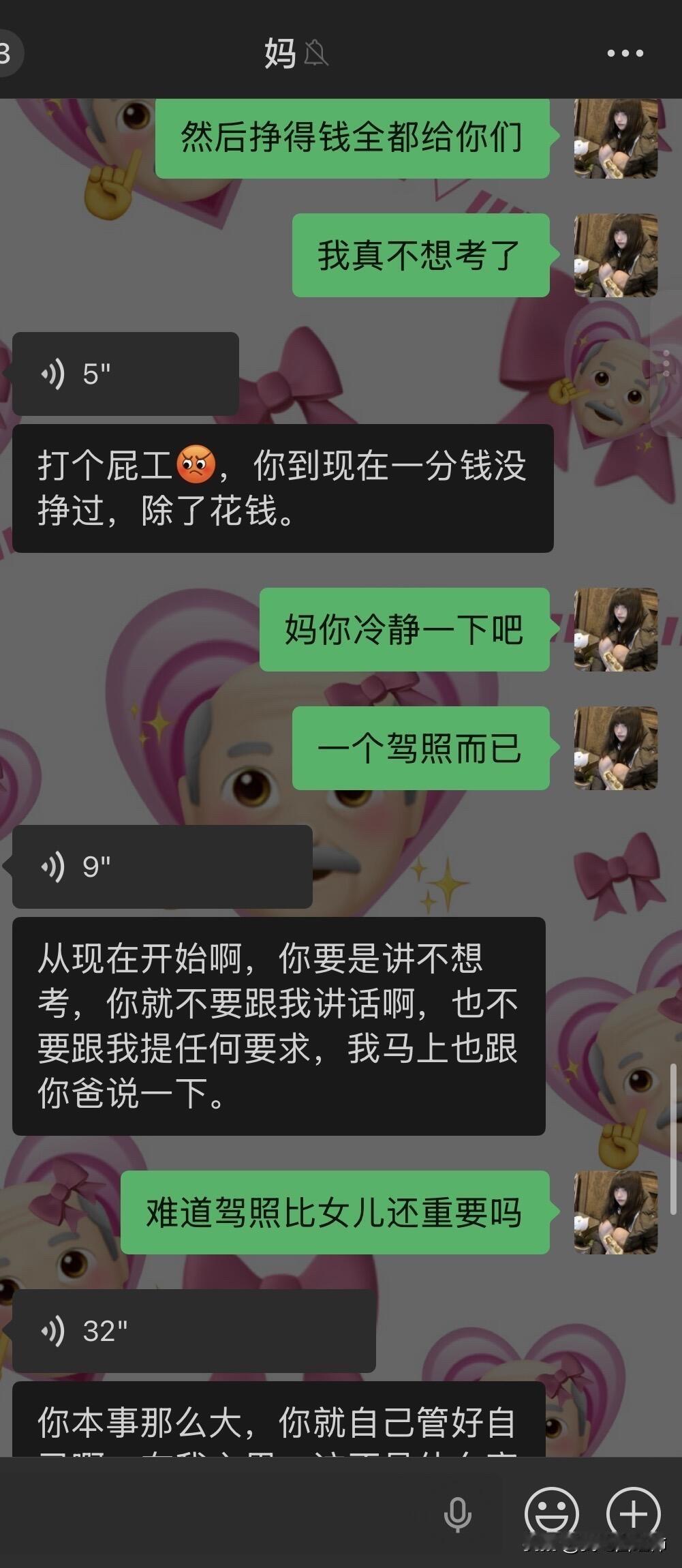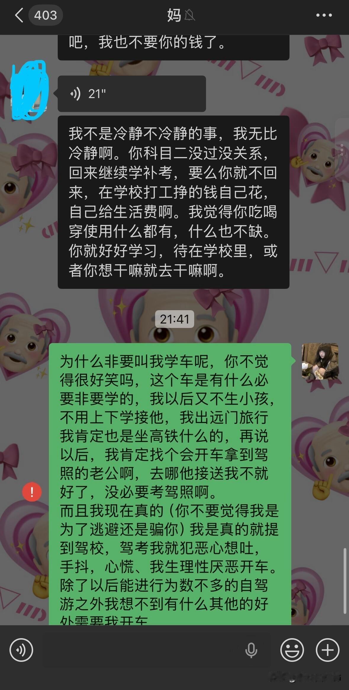 因为驾照跟我妈闹翻了…… 我从高考后就每天都被我爸妈从早到晚的催着去学驾照,他们说我小时候开卡丁车很厉害学车肯定也很简单。我就听信了他们的话去驾校学车,可是科二挂了3次还是没过,其实第二次没过的时候我已经很厌恶开车了,我不懂为什么每次在驾校练的好好的教练都说我一定能过一去考场就挂。而且第一次和第二次没过,我回家后我妈都很失望的看着我然后嘲讽我好多天。第三次我太害怕了,我就把我的分数p了,告诉我爸妈我过了,我就先去学科三了,我想着网上都说科三过了科二就很简单了,但是学了科三后,依旧是教练说我没问题,但还是挂了。 我现在真的是一点都不夸张,说起考驾照我就手抖心慌起冷汗,本来在学校就想着回家就跟爸妈说不考了,好好商量,我妈今晚突然跟我提了这事我就只能讲了,就有了如图的对话……她把我删了 关于我哥,不知道为什么我妈处处都看不惯我哥(我二姑的儿子),我哥做不到的她就一定要求我得做到。但我这次真的不考了,感觉考驾照已经是我的梦魇了。 现在看来我妈是绝对不允许我回家了,请问一下各位网友我该怎么办呢,寒假留校找点家教做吗