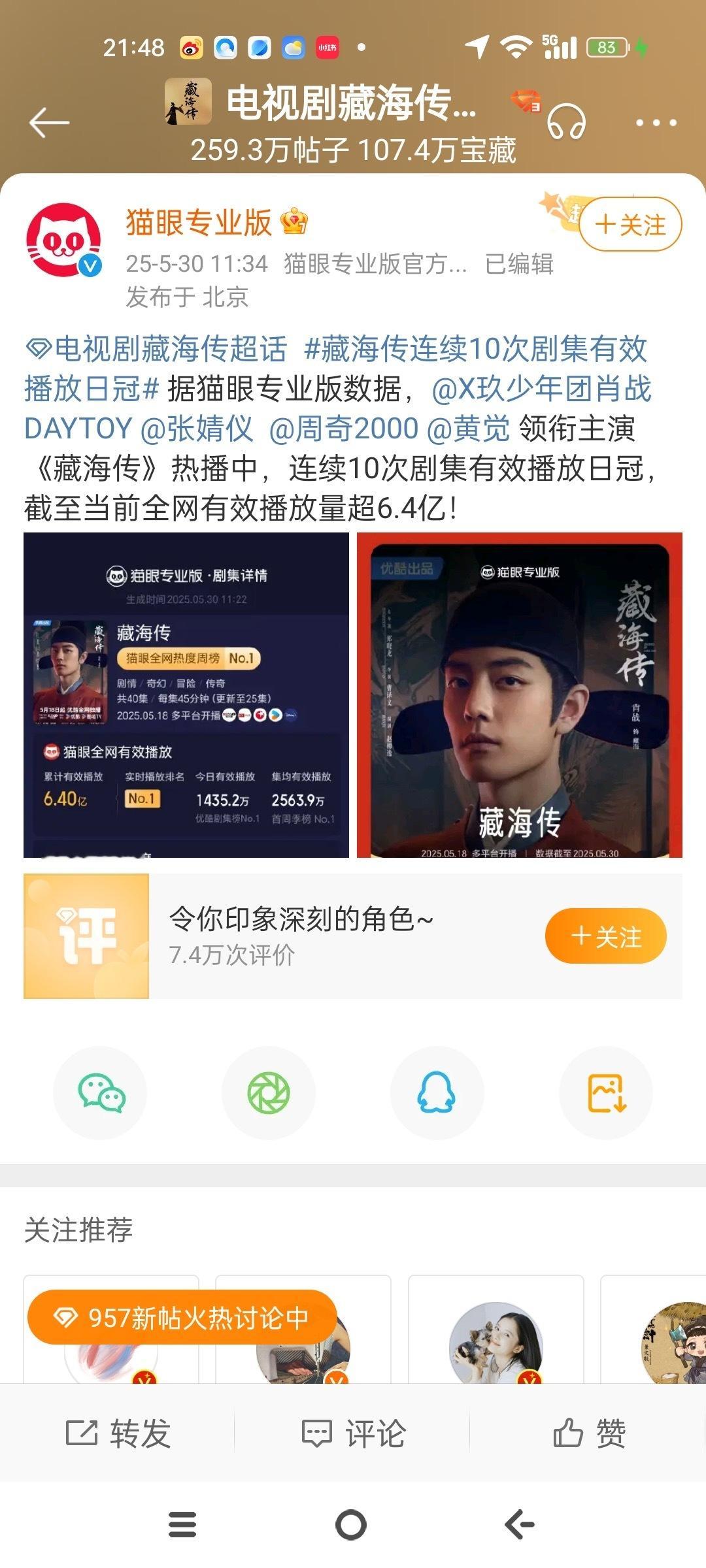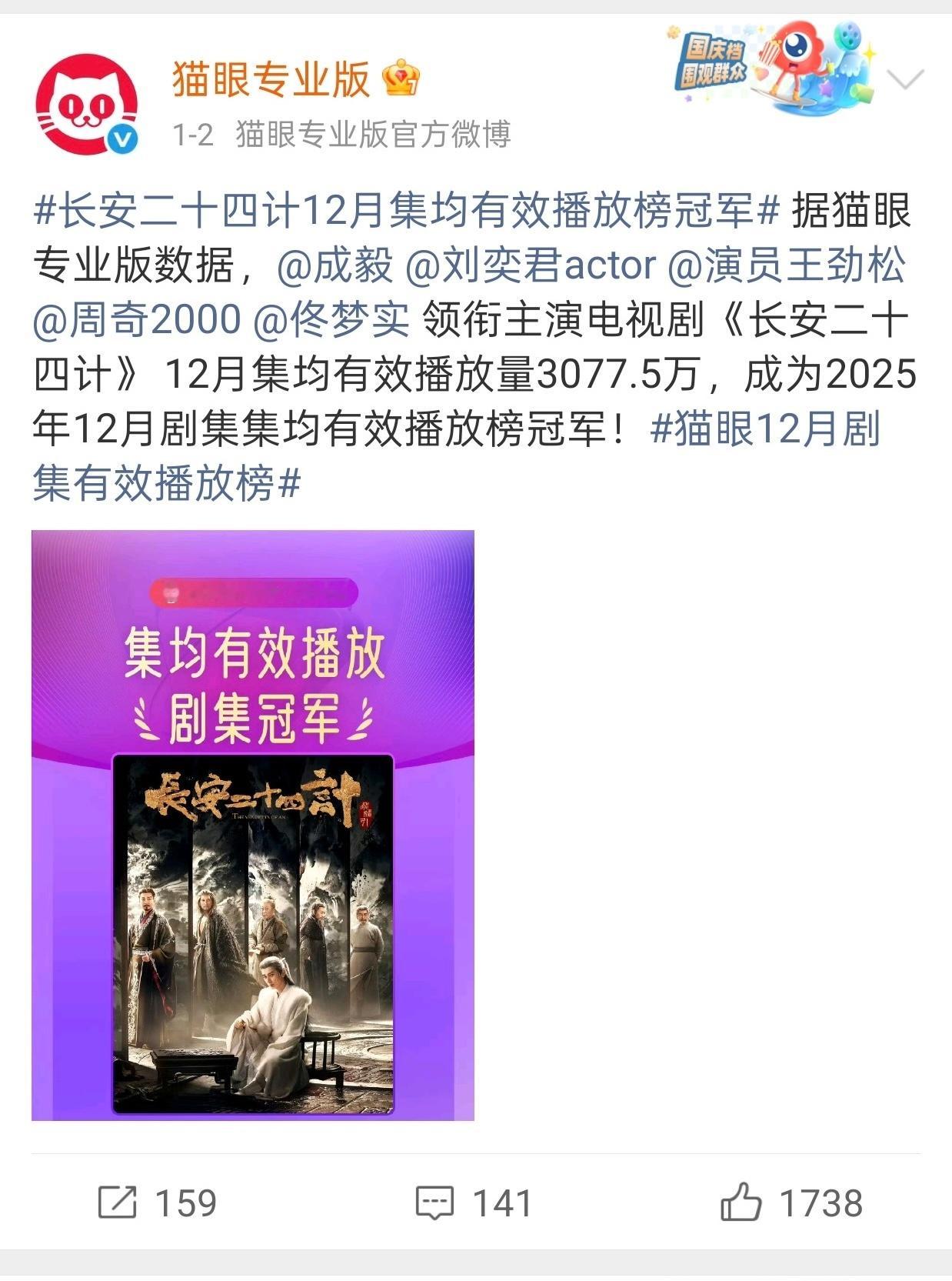 成毅粉丝是不是已经疯魔了,《藏海传》5.18播出,5月播出时间12天,猫眼发博时间5.30日,这是开播12天的数据,《长安二十四计》12.12日开播,猫眼发博时间1.2日,是开播21天的时间,成毅粉丝拿藏海传开播12天的数据和长安二十四计开播21天的数据比,然后说24计赢了???这么喜欢猫眼那你们认猫眼发的《藏海传》2025年剧集热度值总榜年冠和播放量年冠吗,还能这么比的话,怎么不拿2025年的成毅比1990年的肖战,虽然成毅一季三扑,但那会的肖战还是个胚胎呢