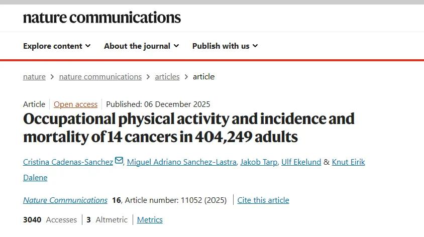 挪威一项针对40万人、随访27年的《自然·通讯》研究显示,职业体力活动与癌症风险存在复杂关联。相比久坐工作,任何体力活动均能使整体癌症风险降低3%-4%,对女性保护更明显。具体而言,走动及重体力劳动可降低子宫内膜癌、结肠癌、乳腺癌等风险,但会增加食管癌发病风险,女性肾癌风险也升高。此外,体力活动对癌症死亡风险的影响同样有利有弊。研究表明,职业活动防癌效果因癌症类型而异,需结合工作特点进行个性化健康管理。