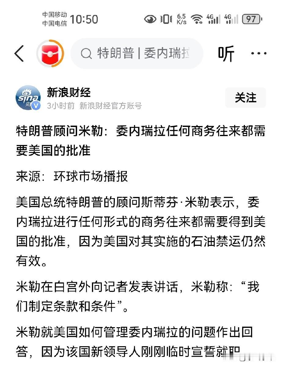 特朗普不装了,开始“管理”委内瑞拉了! 特朗普顾问米勒表示:委内瑞拉的任何商务往来都需要美国批准,美国继续对委内瑞拉实施石油禁运依然有效! 美国着手制定条款和条件,进一步“管理委内瑞拉”! 委内瑞拉军方不买美国的账,委内瑞拉政府依照本国宪法和法律,宣布副总统代行总统权力!防止委内瑞拉出现权力真空! 也就是说马杜罗目前依然是委内瑞拉合法的总统!