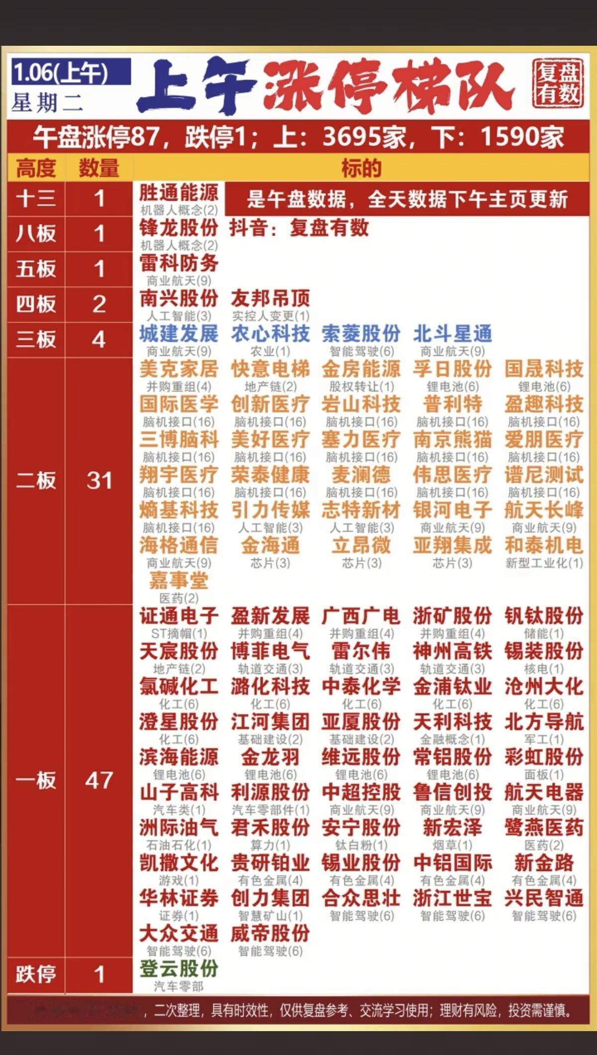 1.06周二 涨停板股票:复盘统计! 涨停板87家,跌停1家 涨跌比3695:1590 涨停焦点:脑机接口,机器人,锂电池