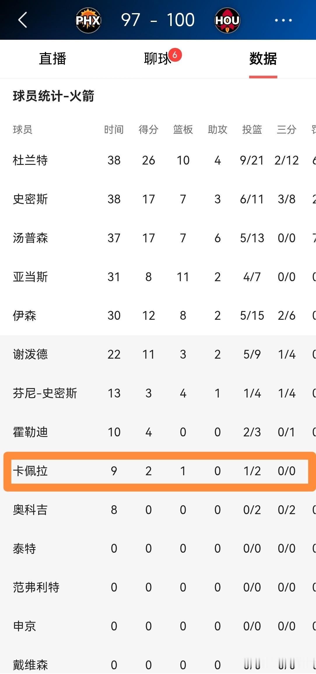 我强烈建议火箭中锋卡佩拉增加自己的出手次数!在今天火箭主场以100:97击败太阳的比赛中,卡佩拉仅仅出手了2次,导致他在进攻端毫无存在感。 全场比赛下来,卡佩拉替补出战9分钟,投篮2中1得到2分1篮板,他的场上正负值为-2。 如果卡佩拉想要得到更多的上场时间,那么卡佩拉必须在进攻端打出出色的表现,他不能只专注于防守,他必须在接下来的比赛中增加自己的出手数。