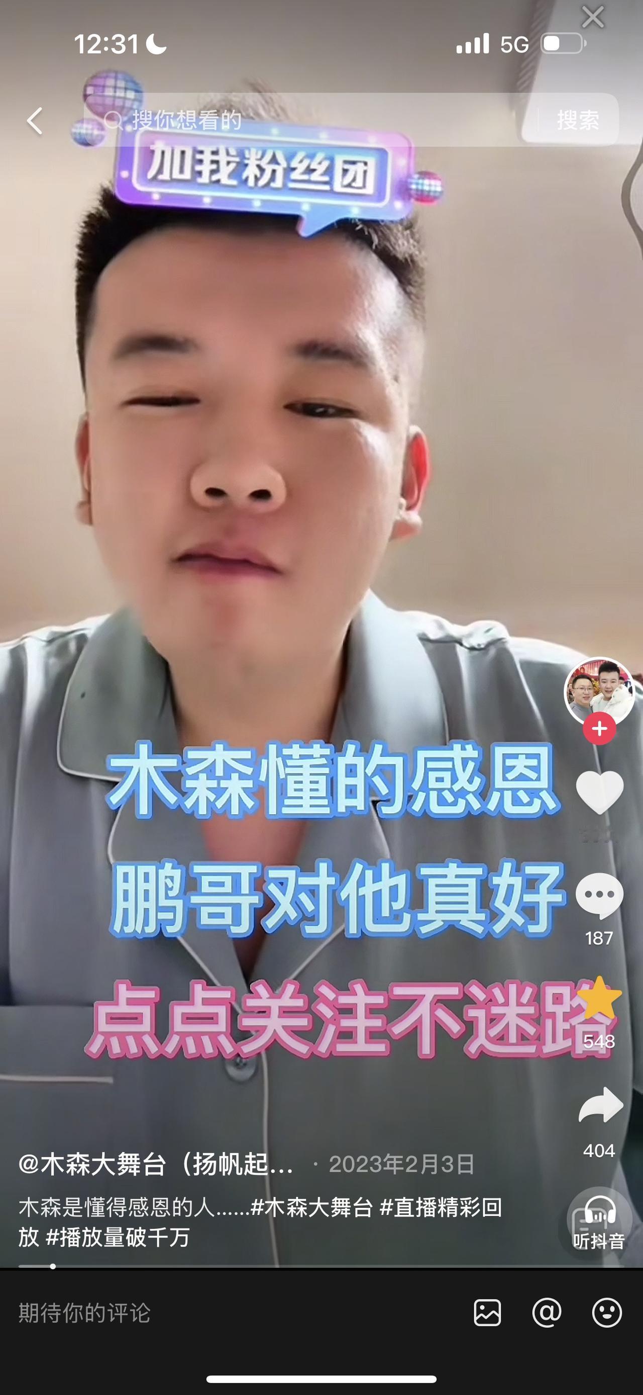 今天刷到木森一个视频,木森说他要感恩鹏哥,木森说他22岁就欠账壹仟多万,是欠鹏哥(现在的老板)的钱,不是鹏哥给出第一笔启动资金办木森大舞台,那有他的今天,所以,他很感恩鹏哥,鹏哥对他真好。