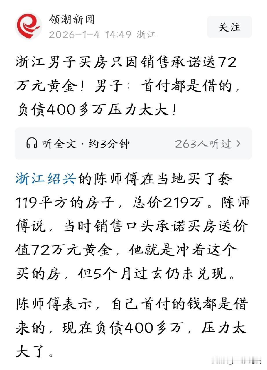 浙江绍兴,男子看重了一套119平的房子,总价219万,就在他犹豫时,销售口头承诺,说买房子送72万元的黄金,两月兑现。男子一听如此划算,瞬间心动,回去东拼西凑付了33万首付。事后,他又借了民间贷,还清了首付款,准备等黄金已到账马上转手卖掉,还贷款。万万没想到,五个多月过去了,黄金迟迟没有兑现。面对将近400万多贷款和高额利息,男子傻眼了。 陈师傅一家四口挤在小房子里,很不方便,所以他一直想改善家里的居住条件。 2025年6月,他看中了某小区一套一楼的房子,面积119平,总价219万多。 房子户型好,交通也便利,但价格对他来说太高了,他实在拿不出这么多钱,一时间他犹豫不决,站在售楼处反复盘。 看着他有所顾虑,销售小洪赶紧表示,公司最近搞活动,买房就送价值72万元的黄金,而且2个月左右就能兑现。 陈师傅一听这话,瞬间心动,这要是真送72万黄金,那房子不就相当于便宜了一大截,这价格可太划算了。 想到这儿,他已经盘算好,先贷款把房子买了,等黄金到手之后马上转卖,很快就能还清一部分贷款,这样压力不就小多了。 于是,他当即就订了一套。房子首付款要51万多,不过他们家可以享受将近18万的二胎补贴,这样算下来只用付33万元。 可即便如此,33万对他来说也不是个小数目。但为了能住上新房子,他咬咬牙,东拼西凑,到了7月28日,终于付清了首付。 8月4日,168万元的银行贷款也顺利下来了。 陈师傅满心期待72万元的黄金能赶紧兑现,他好马上去还贷款。 可让他万万没想到的是,几个月过去了,销售承诺的黄金迟迟没有兑现。 这下,陈师傅可急坏了,自己首付的钱是借来的,借的民间贷,一个50万,一个10万。 好不容易还掉了之前借的首付款,结果现在又因为这迟迟不到的黄金,背上了将近400多万的负债,这巨额贷款像一座大山,压得他喘不过气来。 而且,现在全家四口人还挤在那套老破小里,他心里别提多难受了。 陈师傅多次联系销售小洪,对方在微信上告诉他:黄金我帮你盯着呢,到了就通知你。 可本来说两个月就能兑现,已经都拖了五个月了,还是没有动静。 陈师傅心急如焚,他要尽快拿到黄金去周转资金,要不然实在是撑不下去了。 无奈之下,陈师傅只好来到售楼部,希望能得到一个明确的答复,可工作人员却对他不理不睬,没有做任何回应。 陈师傅只能再次拨通销售小洪的电话。 这次小洪回复说:缓期六个月,他还没到时间。这个时间究竟是怎么算的呢? 小洪表示,时间是从银行放款全款到账算起。按照他的说法,价值72万元的黄金会在2026年2月4日给陈师傅。 可陈师傅表示,这个时间节点自己根本不能接受,他现在有不少负债,借款利息也很高,偿还起来非常吃力。 他只希望能尽快拿到这笔黄金,缓解一下自己的经济压力。 从法律角度,应该如何看待此事? 《民法典》第577条规定:当事人一方不履行合同义务或者履行合同义务不符合约定的,应当承担继续履行、采取补救措施或者赔偿损失等违约责任。 销售承诺“买房送价值72万元黄金、约2个月兑现”,内容具体明确,且直接促使陈师傅借款凑首付、贷款购房,对合同订立与价格判断有决定性影响,应认定为合同条款,开发商须履行。 销售小洪的行为属职务行为,法律后果由开发商承担。 陈师傅可要求,开发商继续履行,交付72万元黄金或等值价款,并赔偿因逾期兑现导致的利息损失、民间借贷利息、资金周转损失等。 若开发商以“缓期六个月”单方变更期限且无合理依据,陈师傅可拒绝并主张该变更无效,要求按原约定期限履行。