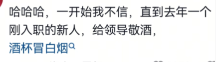 哈哈哈,一开始我不信,直到去年一个刚入职的新人,给领导敬酒,酒杯冒白烟