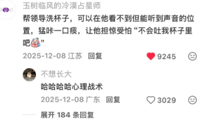 帮领导洗杯子,可以在他看不到但能听到声音的位置,猛咔一口痰,让他担惊受怕"不会吐我杯子里吧
