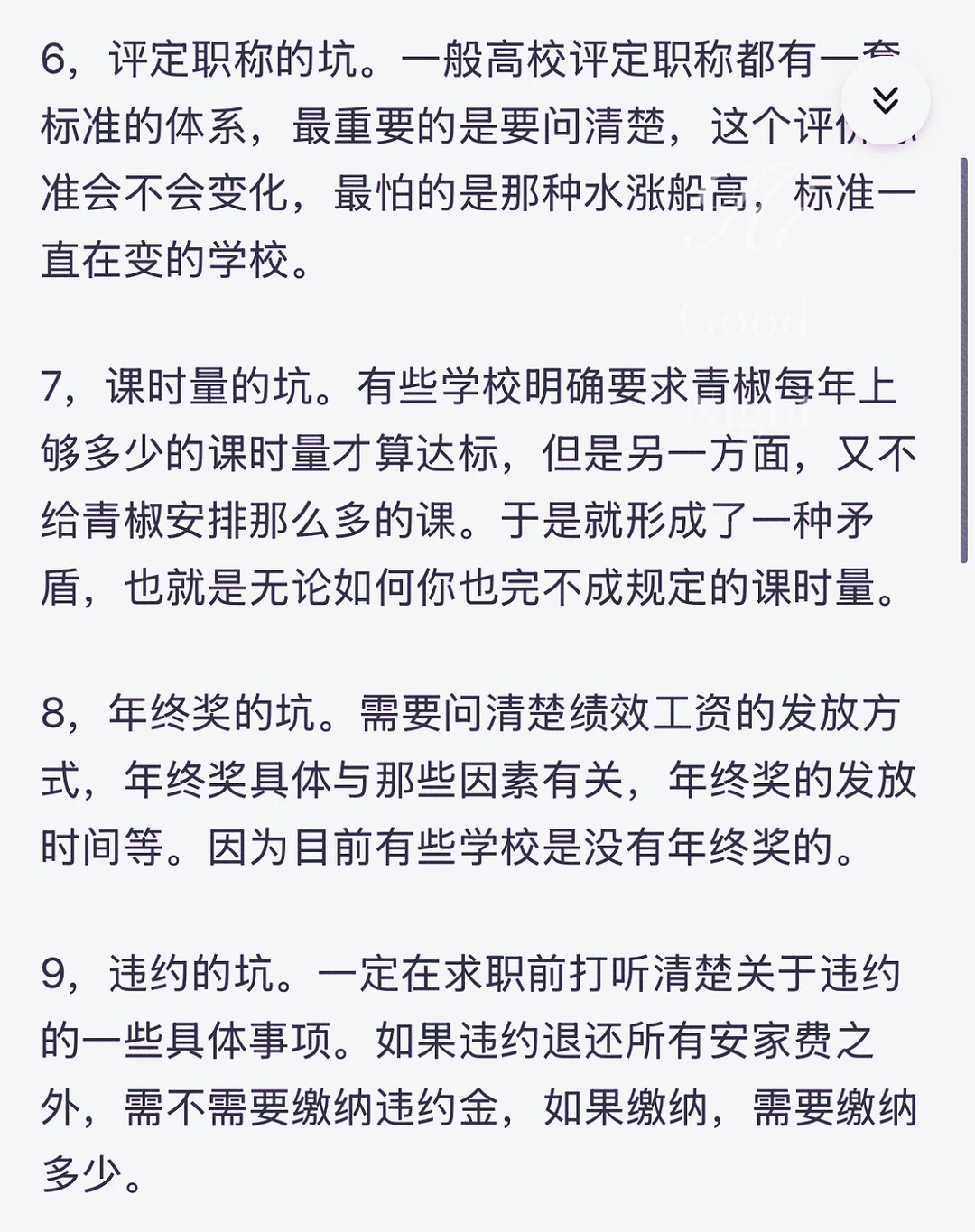 6,评定职称的坑。一般高校评定职称都有一套标准的体系,最重要的是要问清楚,这个评价标准会不会变化,最怕的是那种水涨船高,标准一直在变的学校