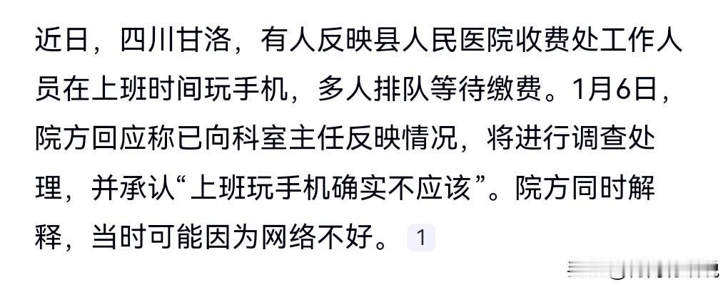 上班摸鱼是不对的,摸鱼就是摸鱼,不要找那么多借口。 近日四川甘洛,有人反映县人民医院,收费员上班玩手机。 那确实太不应该了,那么多人看着还在那里玩手机,那别人肯定有意见了。 哪怕是在那里发呆,也不能够玩手机啊。 医院回应称可能是网络不好。 哪怕是发呆,都不能够玩,这是底线。
