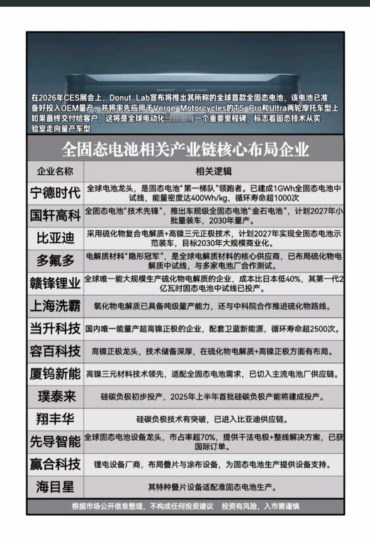技术突破!全球首款全固态电池! 可量产,5分钟即充满电! 相关核心龙头股整理: