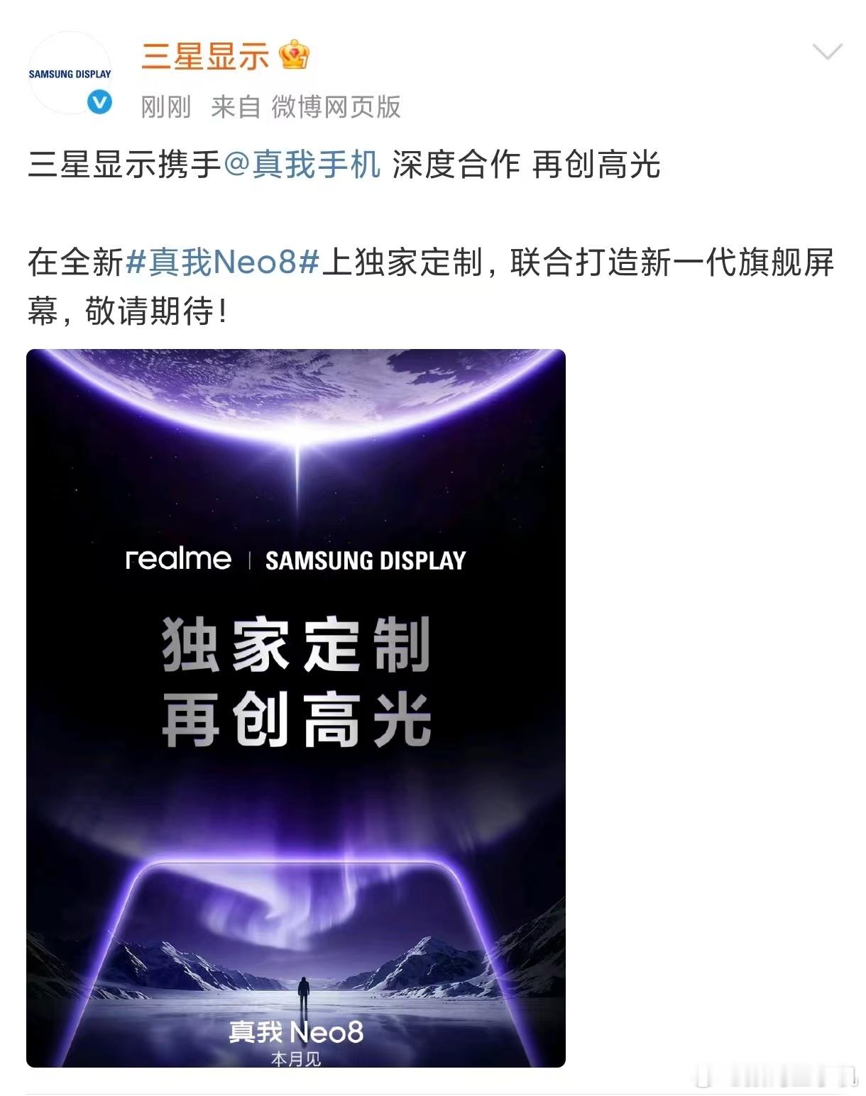 真我手机×三星显示重磅合作开年越级大作真我Neo8,独家定制三星旗舰屏幕,再创高光!