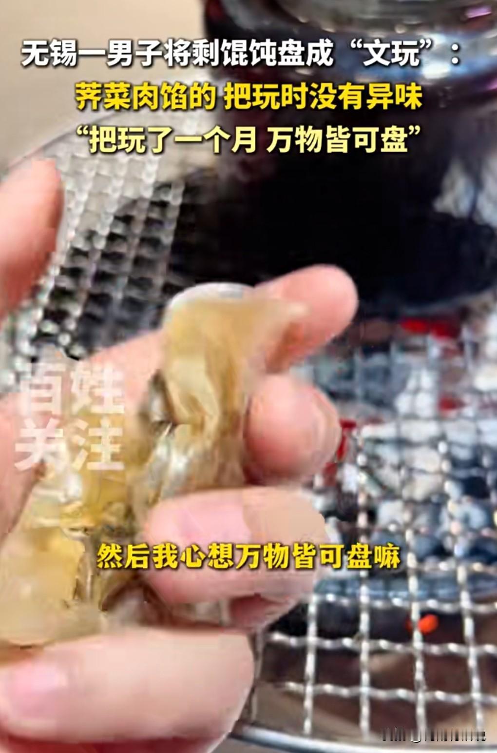 这真是太离谱了啊,竟然还有盘馄饨的! 1月5日,一男子发视频称,将剩馄饨盘成“文玩”。 这真是万物皆可盘呀。 也是够无聊的。 盘什么不好,剩下来的馄饨都要盘,这么喜欢盘,怎么不去盘石头啊? 男子说以后准备盘一下小笼包。 这男子也是够无聊的。 不过也是物有所值啊,竟然让他盘上了热搜。