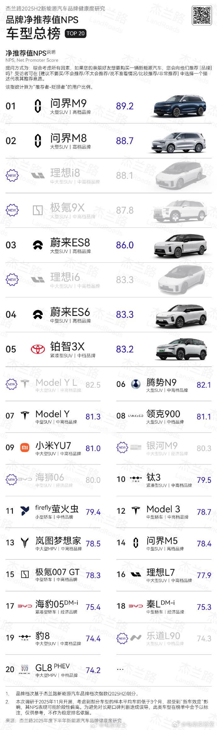 问界品牌与问界M9排在了杰兰路品牌净推荐值榜单的榜首。与销量榜相比,净值推荐榜其实更能反映用户的口碑和品牌号召力,排在前五的品牌还有特斯拉、萤火虫、蔚来以及理想。合资品牌维度,丰田以及其旗下的BZ3X则是合资选手中用户满意对最高的选手。鸿蒙智行蔚来新能源汽车
