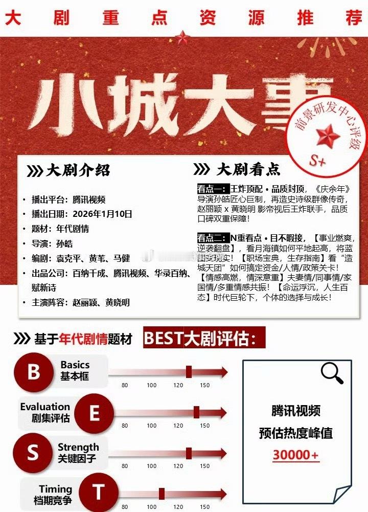 赵丽颖《小城大事》招商介绍说,基本盘从主创阵容、主创团队、播前影响力等来看几乎没有短板,该剧站位年代剧全民爆款区预估腾讯峰值30000+