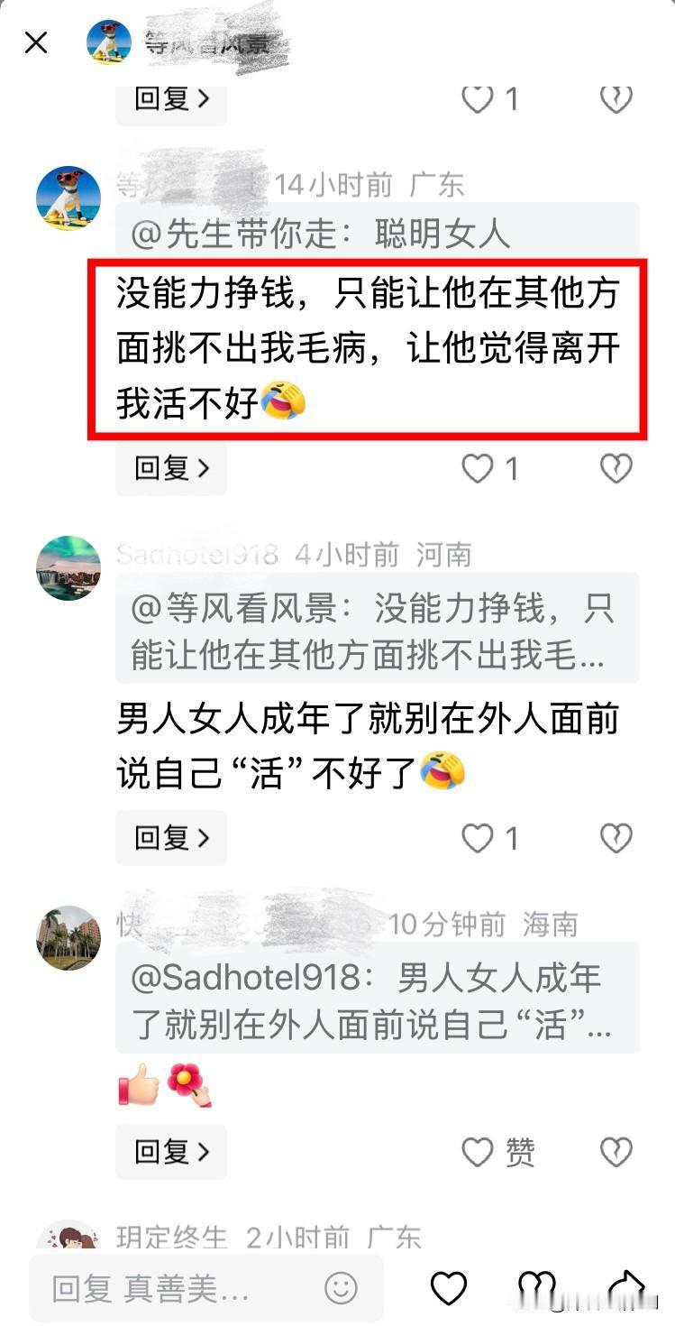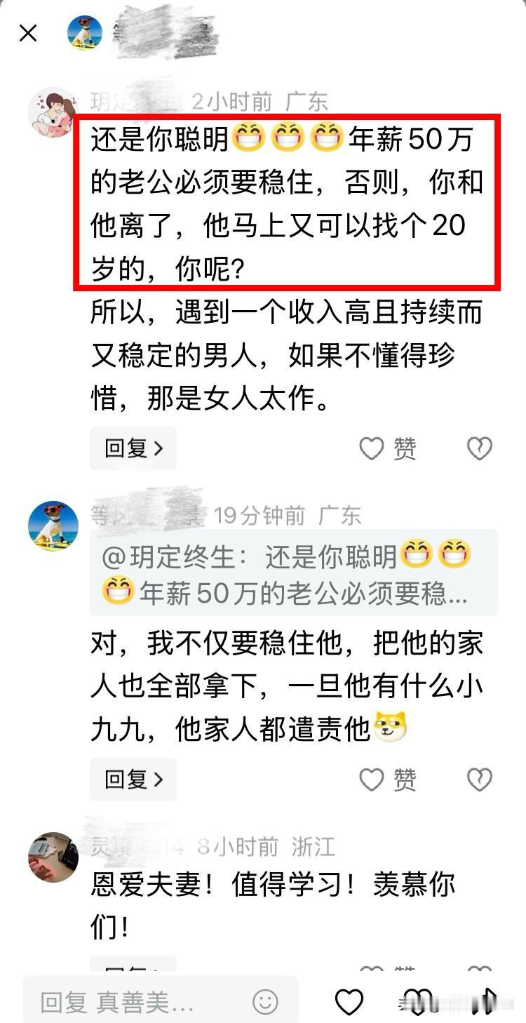 老婆大专、没有收入,老公985硕士、年薪50万,老婆就该给老公剪手指甲、脚指甲吗? 我今天看到评论区一位网友说,她大专学历,她老公985硕士、年收入50万。她把老公当宝贝一样伺候,连老公的手指甲、脚指甲都是她帮剪。 她还说,自己没能力挣钱,只能让老公在其他方面挑不出她的毛病,让老公觉得离开她活不好。 我评论了她一句,说她给老公剪脚指甲有点卑微,没想到好几个人说这不是卑微,说她很聪明,说她的做法值得学习。 因为老公学历比自己高、收入比自己高,自己就要像保姆一样伺候老公、讨好老公,以此来维系婚姻关系,这还不是卑微吗? 我觉得女人在婚姻里沦落到要替老公剪脚指甲这种地步,就是卑微!大家觉得呢?