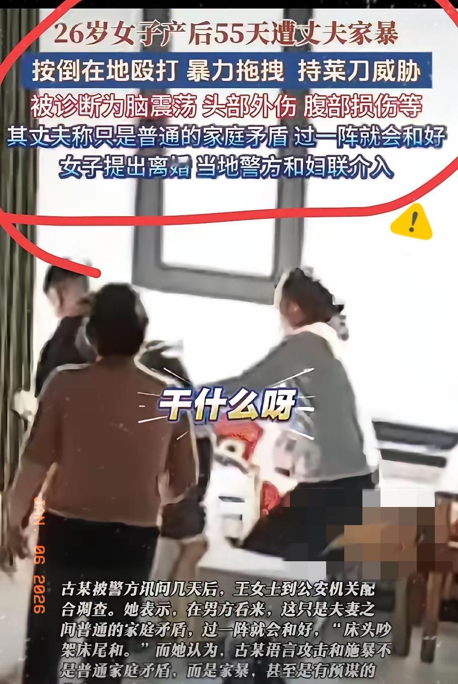 一分钟都不等,马上离婚! 女子产后55天与丈夫因空气净化器发生争执,没想到丈夫竟然对她拳打脚踢,并用菜刀威胁她。即便是女子的丈母娘和婆婆也劝不住他。 最让人愤怒的不是争执本身,而是他拿捏产妇“身子虚、难反抗”的恶意,更把家暴轻描淡写说成“家庭矛盾”。产后55天的产妇要扛伤口疼痛、育儿疲惫,换来的却是拳打脚踢和菜刀恐吓,这哪里是夫妻,分明是拿婚姻当伤害的遮羞布。 别觉得“生了孩子就绑定了”是借口,真正的婚姻从不是拿捏软肋,而是心疼对方的付出。法律早明确家暴不是家务事,警方立案、妇联介入就是最好的证明,受害者就该果断反击。 婚姻的安全感从不是靠忍出来的,而是靠底线和法律撑起来的。如果遇到这种情况,你会建议当事人果断离婚还是再给一次机会?