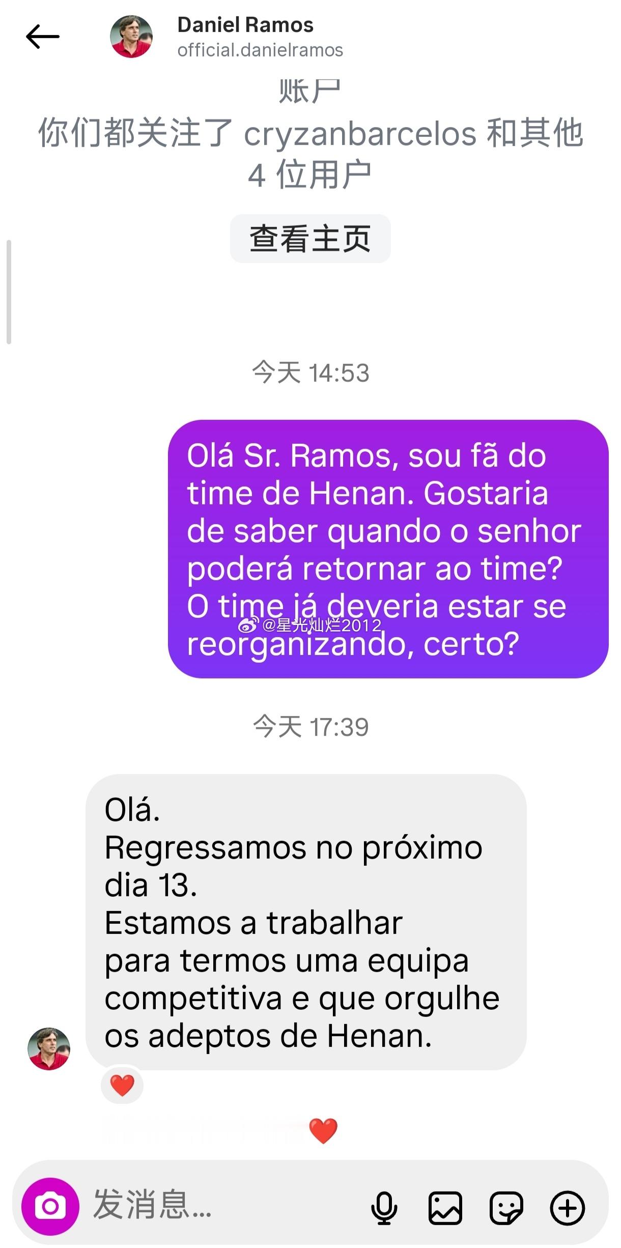今天下午在和拉莫斯交流的时候他再次确认,拉莫斯表示河南队将在1月13号正式集中,同时表示相关的冬训准备工作正在进行当中新赛季我将努力争取能够组建一支,让球迷感到骄傲并且有竞争力的团队