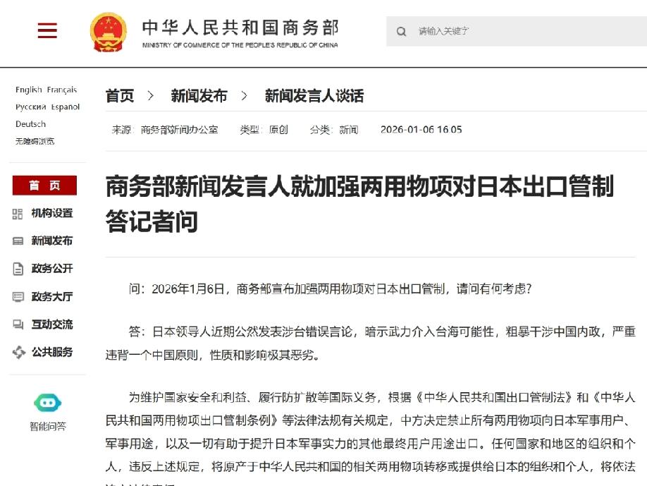 日媒:北京在李在明访华期间,对日发布两用物项禁令新规! 1月6日,日本共同社报道:“中国商务部周二发布新年第一号公告,称为维护国家安全和利益、履行防扩散等国际义务,根据相关法律决定加强两用物项对日出口管制,中国在李在明率大型代表团访华期间,再次升级日中争端,分化日韩意图明显......” [机智]日媒的分化论,纯属贼喊捉贼的强盗逻辑,中方禁令是对日本军国主义复燃的正当反制,更是对历史正义的坚守!1910年起日本殖民朝鲜半岛35年,强征20万韩籍青年当炮灰、数万女性为慰安妇,这份血海深仇中韩人民铭记至今!如今,日本防卫费飙至9万亿日元,高市公然叫嚣介入台海,而李在明访华明确恪守一个中国原则、标注“中国台湾”,恰是中韩对日本右翼的共同警惕,中方掌控98%镓资源、80%钨供应链,禁令精准掐住日本扩军命脉! 所谓“分化日韩”,不过是日本心虚的托词,真正分裂东亚的是其否认历史、穷兵黩武的行径,中韩携手是历史必然,更是对地区和平的守护,日本若不回头,终将被彻底孤立!