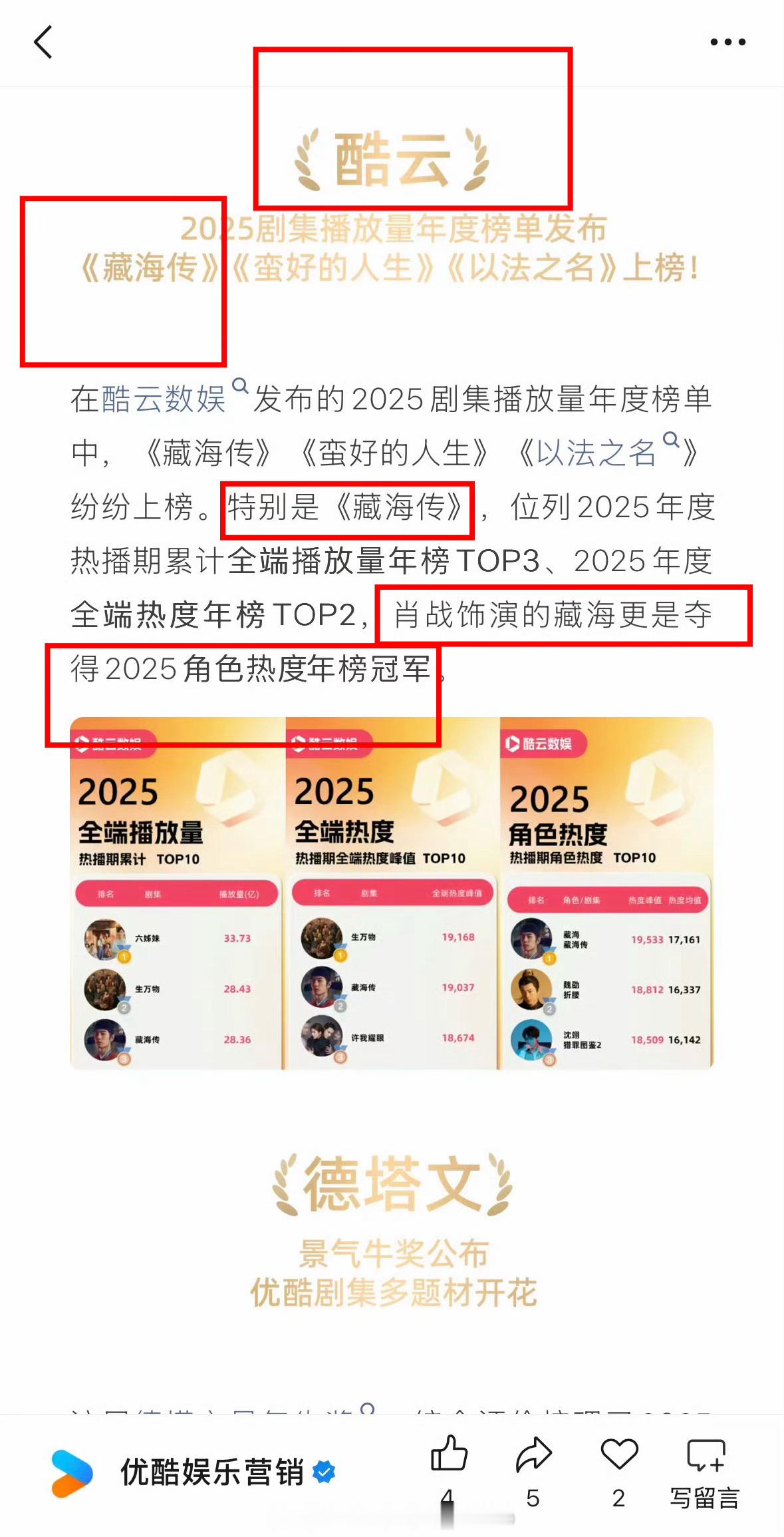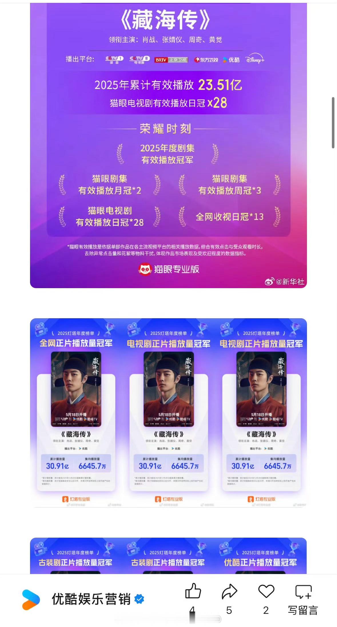 优酷官方2025成绩单满屏都是藏海传,豪揽31项冠军,各种奖项拿到手软,可以看出👖有多欣慰了,直接把满意刻在脑门上,肖战藏海传剧王的含金量依旧再上升!!