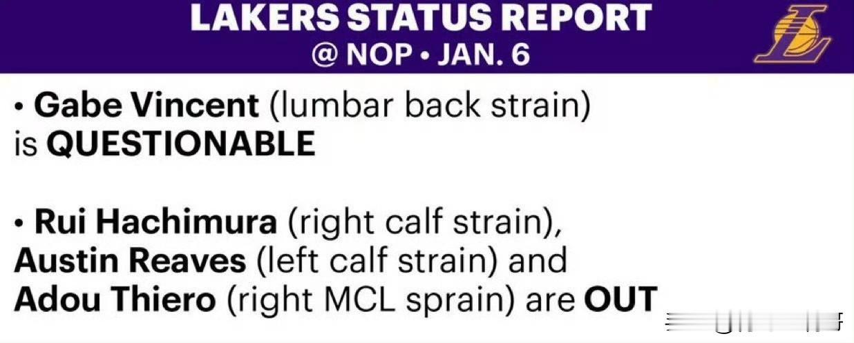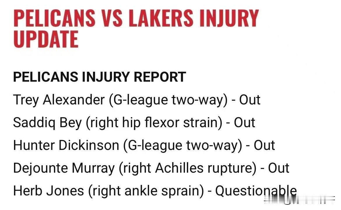 湖人vs鹈鹕比赛预告!!!湖人对阵鹈鹕比赛预测,湖人被看好! 北京时间1月7号,湖人将做客新奥尔良挑战西部倒数第一的鹈鹕队,湖人西部第三,双方实力差距悬殊,可以说悬念不大,但是鹈鹕主场不会轻松让湖人带走胜利的,一起来看下比赛预告。 湖人伤病情况: 文森特状态升级为出战成疑,这家伙快复出了; 八村、里夫斯和蒂耶罗仍然继续缺阵。 鹈鹕伤病情况: 贝和穆雷确认缺席比赛,赫伯-琼斯的状态是出战成疑。 目前从ESPN给出的预测结果来看,湖人以超过6成的胜率被看好拿下比赛,鹈鹕虽然和湖人成绩相差较大,但是也有3成以上的胜率。 贝的缺阵对鹈鹕影响比较大,他们又少了一个进攻点,如果琼斯再缺阵,那么湖人真的是没什么压力了。 湖人 nba 湖人 湖人比赛