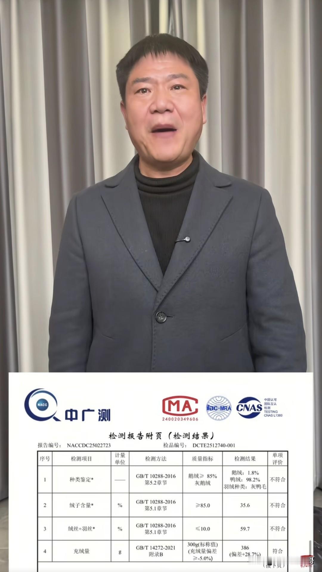 “反诈老陈”又来硬核打假了,这次他喊话的是知名网红查理王在直播间兜售的一款羽绒服,据老陈介绍,直播间里号称百分百鹅绒,假一赔十,经得起任何检测。结果有消费者下单后直接邮寄到检测公司检测,其中鹅绒含量1.8%,鸭绒含量98.2%,羽绒种类是灰鸭毛,按鉴定结果就是属于不合格产品。 目前老陈已经发视频点名,对于这种与宣传不符的直播卖货,相关部门应该加强监管,以免更多消费者上当受骗。