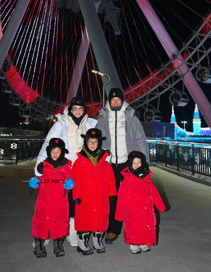 胡杏儿一家哈尔滨旅游在微博晒出一家五口同游哈尔滨的照片,三个小朋友整整齐齐地穿