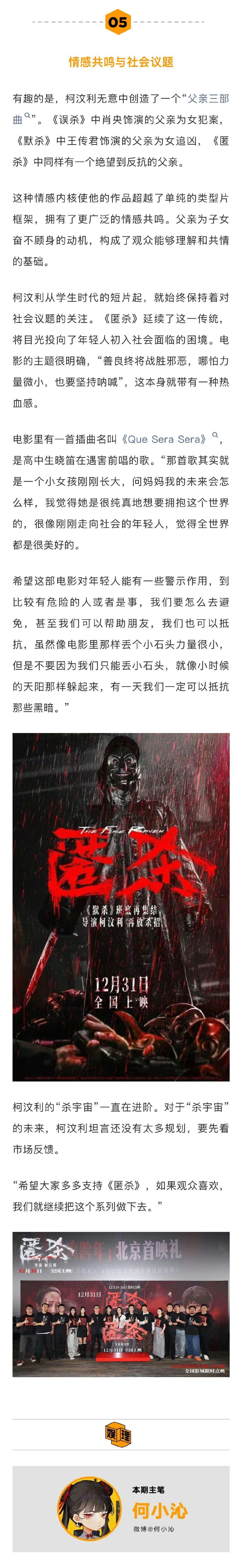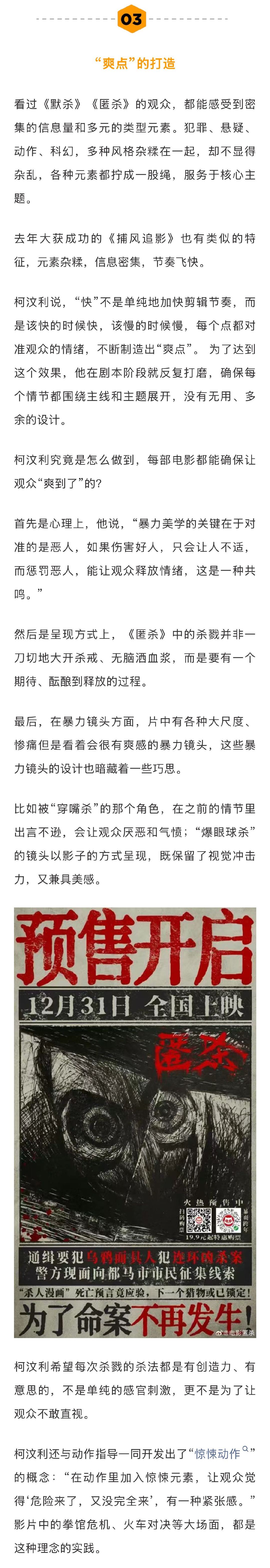 匿杀导演回应如何能让观众爽到 柯汶利希望每次的杀法都有创造力《误杀》《默杀》《匿杀》三部作品顺着“被动-反抗-主动”的脉络生长,导演柯汶利表示,早期没有刻意规划要做一个“杀”系列,它在一部一部的创作过程中自然形成的。清晰的类型标识能降低观众的认知成本,同样是以“杀”为核心的两字片名,观众可以直接获悉电影的类型和气质,带着明确的预期走进电影院…娱理独家↓