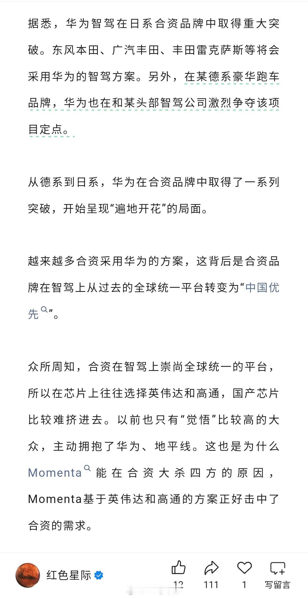 《红色星际》的消息,华为智驾在日系合资品牌中取得了突破。东风本田、广汽丰田、丰田雷克萨斯等将会采用华为的智驾方案。另外,在某德系豪华跑车品牌,华为也在和某头部智驾公司激烈争夺该项目定点。42how新能源汽车