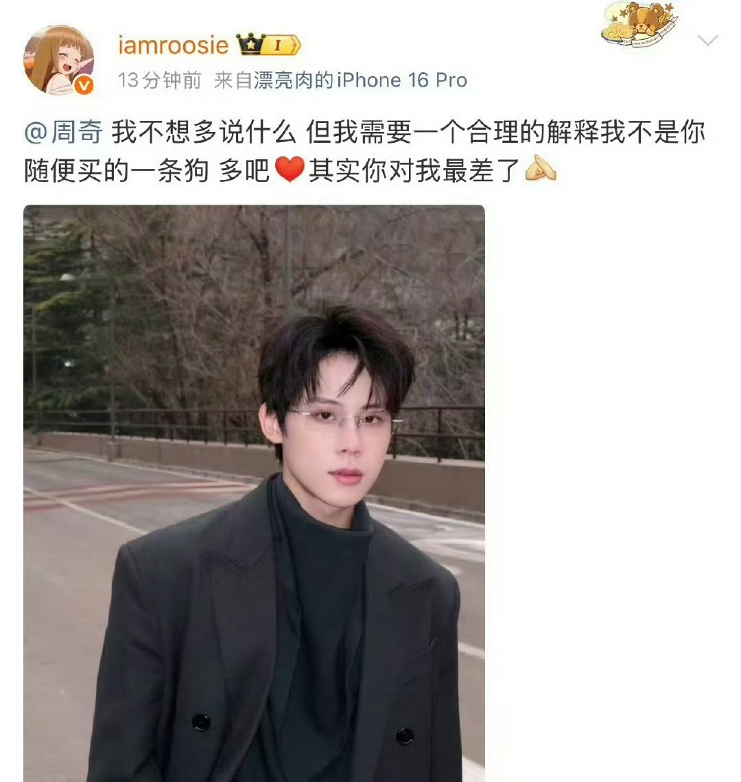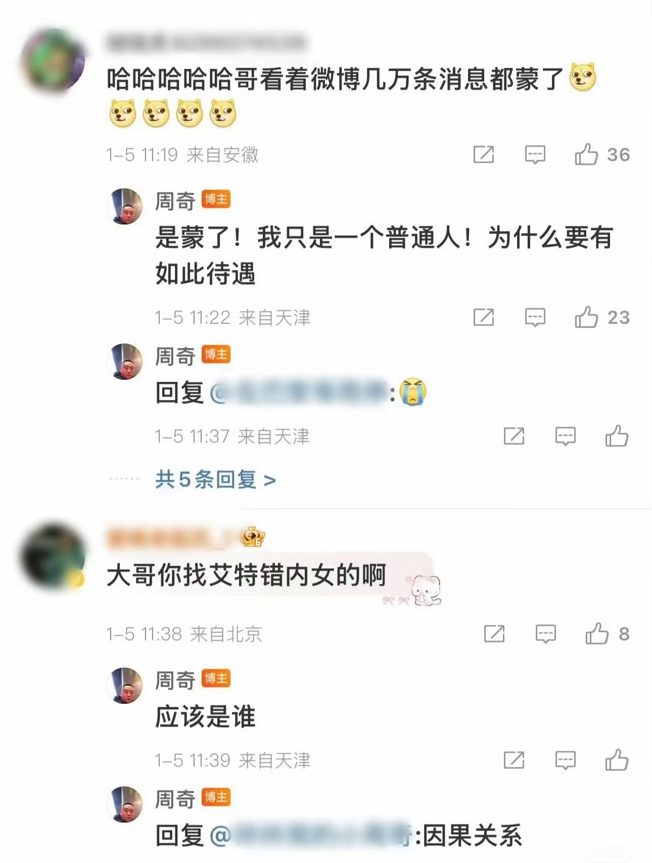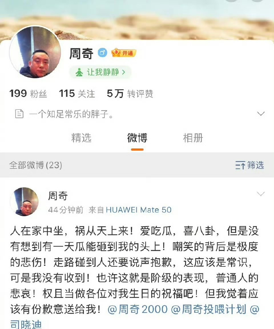 万万没想到周奇司晓迪的瓜竟然牵扯到了另一中年男子身上,只因该男子的网名叫“周奇”。司晓迪锤周奇却艾特错人,她艾特了“周奇”。但演方一凡的明星周奇网名其实叫“周奇2000”,而网名叫“周奇”的大哥则是一位素人。后知后觉的素人大哥,今天才知道自己被卷入了这场开年大瓜中。无辜的素人周奇发文回应,他说人在家中坐,祸从天上来。锅砸到他头上,应该向他说声抱歉,但没人和他说,那就当是给他的生日祝福。然后为了把歉意传递下去,艾特了另一个素人司晓迪。[捂脸]不得不说这个大哥还挺有网感,回应的很幽默。