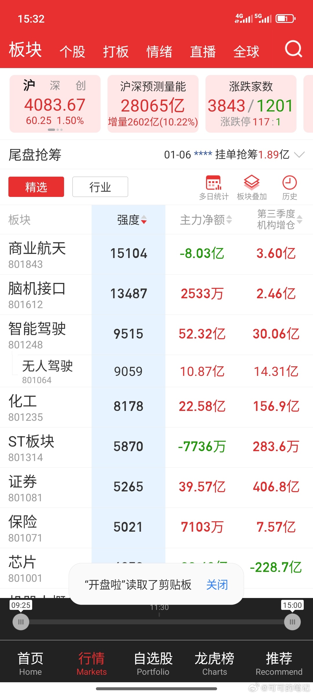 十三连阳,气氛像过年!指数,午后继续稳步向上,有点儿六亲不认的意思。商业航天,午后也是继续加强,脑机,午后也是没有分歧,不过也没有加强,那么分歧大概率就留到明天了,先看看能不能抗住吧,能抗住再保持关注。其他方向,也没什么可说的,强普涨行情,几乎和昨天一样,个股4100多家上涨,涨停更是到了143家,比昨天多了近20家,连续两日超百股涨停。节前还在说,节后要注意布局春季行情了,结果直接来了春季躁动,估计接下来就会看到很多用这两个词描述行情的了。明天,指数的预期是震荡,总不能连续3天放量拉升吧?题材,商业航天依旧是主线,有分歧就低吸核心票,也可以做T,直到核心集体跌停再说行情结束吧。沪指涨超1%再创十年新高