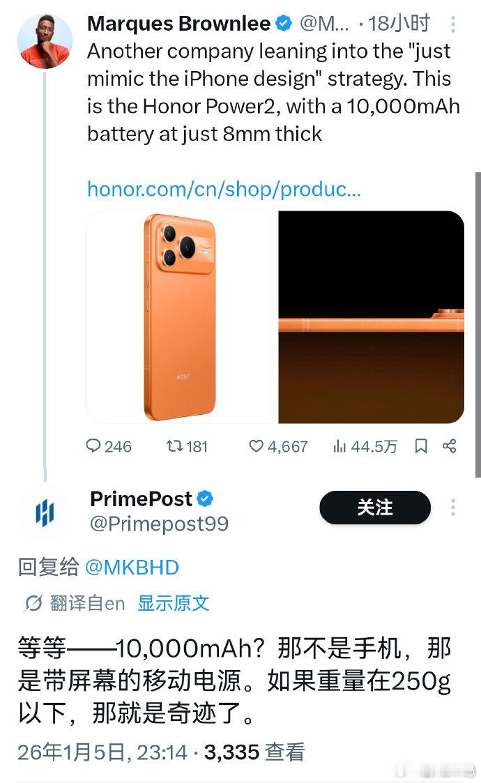 荣耀Power2大电池震惊老外荣耀Power2在电池容量与机身厚度的平衡上展现出明显技术优势,10080mAh容量电池被整合进7.98mm厚度的机身中,这一设计引发国外头部数码博主的广泛讨论,有海外网友提及对中国品牌的这类技术突破感到意外。此外,该机首创的平行双规天线设计。