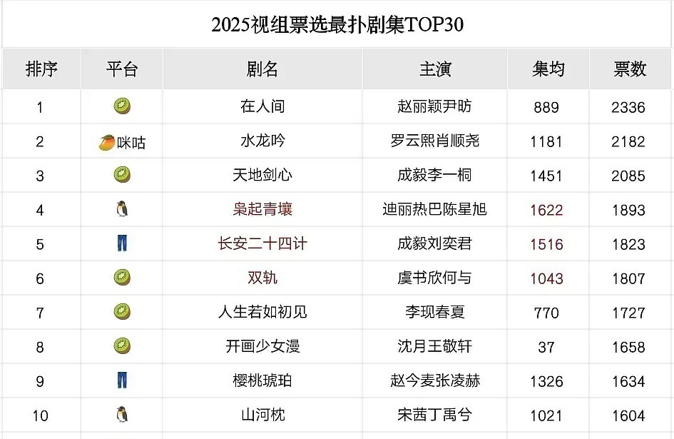 豆瓣评选了2025年最扑的剧,不少大剧都在其中,这也说明长剧真的没人看了,这里面还不乏当红流量,赵丽颖的在人间,迪丽热巴的枭起青壤集均都不高,1500集均都算高了,你们说演员的扛剧能力在哪里呢? 2025年度最扑剧集