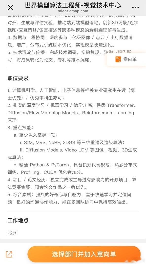 高德正式布局世界模型高德将发布世界模型产品刷到高德布局世界模型的消息真的让人太惊讶了。李飞飞团队早就说过,现在的AI光会说话没用,得懂物理世界、懂空间关系才算真智能。而世界模型就是实现这一点的核心,简单说就是让机器脑子里有个“活的数字地球”,不光能看清路,还能预判路况、理解场景。他们能在WorldScore拿多项第一,说明不是吹的,而是真有技术积累。再加上高德内部组建具身业务部,并在全球范围内招揽具身智能产品专家及算法工程师。和阿里千问的生态联动,明显是要从“手机导航”跨界到“物理世界智能”。以后我们可能真的不用自己费脑想行程、查路况,AI能把所有事都安排得明明白白,甚至实体机器人能帮你跑腿。