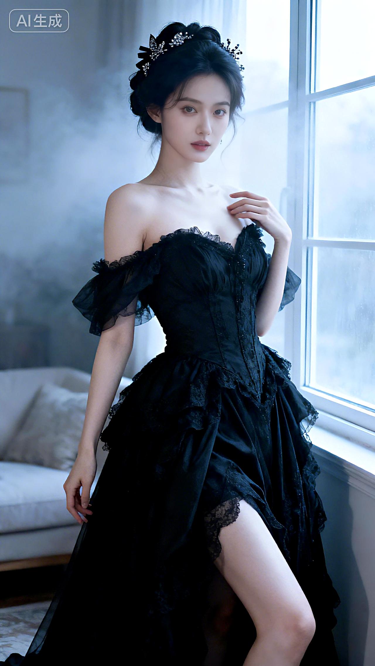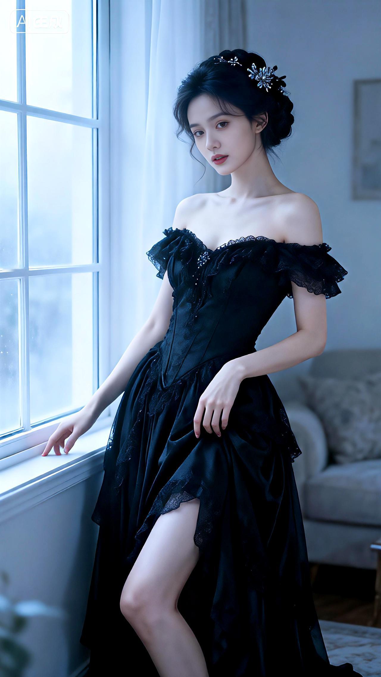 朦胧窗边,一袭黑裙尽显复古风情。 豆包 写真 壁纸 气质黑裙 气质黑长裙