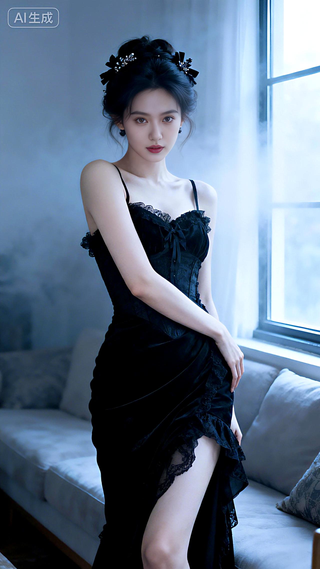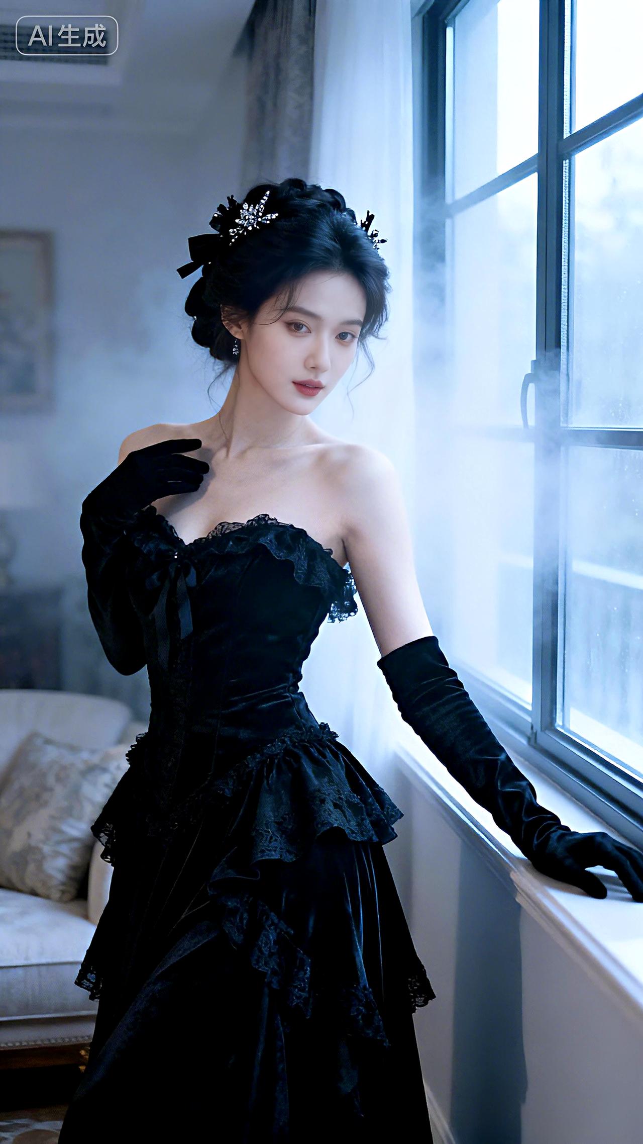 朦胧窗边,一袭黑裙尽显复古风情。 豆包写真壁纸气质黑裙气质黑长裙