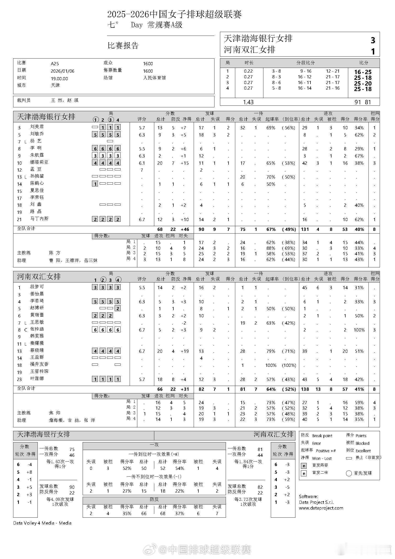 排超联赛2025-2026中国排球超级联赛 天津渤海银行 3-1(16-25/25-18/25-20/25-18) 河南双汇技术统计进攻:53-57;拦网:8-8;发球:7-1;自失:15-23天津渤海银行娜塔莉亚 20分(42扣16中 1发3拦)刘美君 13分(29扣10中 2发1拦)马丁内兹 12分(16扣10中 1发1拦)刘敏乔 9分(8扣5中 2发2拦)李响 9分(28扣8中 1拦)刘鑫 2分(5扣2中)朱航霆 2分(3扣2中)陈鹤心 1分(1发)河南双汇蔡晓晴 20分(39扣20中)姆拉杰诺维奇 18分(43扣18中 0发0拦)段梦可 14分(45扣14中)李若琦 5分(6扣2中 3拦)张梓涵 5分(2扣2中 3拦)黄瑞蕾 3分(2扣1中 2拦)赵博研 1分(1发)
