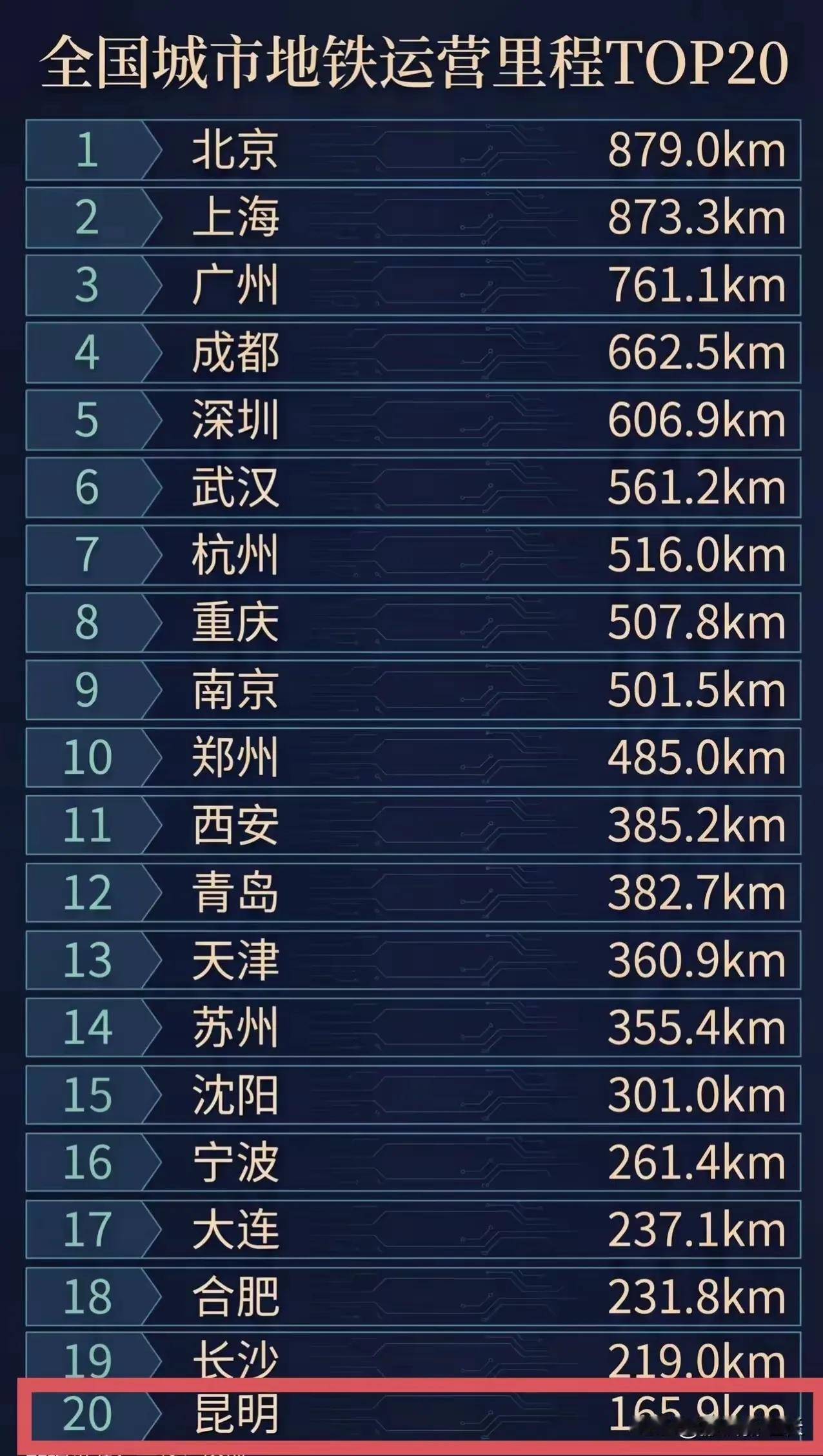 昆明地铁的里程不短啊! 昆明地铁的运营里程己经进入全国地铁里程的前二十位,刚好第二十位。 北京第一,成都超过深圳达662.5公里,多了六十公里左右,进入全国第四名,长沙虽然比昆明长不了多少,可是客流强度遥遥领先的存在。 以上仅供参考,属个人意见!希望昆明的客流强度上去,但是还是要想办法,大家论区留言,什么办法最管用。