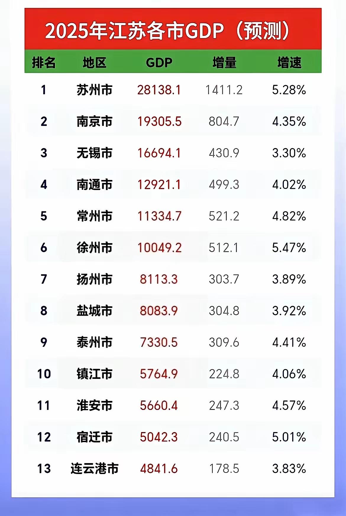无锡增长最低为什么❓江苏城市gdp 江苏gdp排名 从这张2025年江苏各市GDP预测表,我们可以看到几个鲜明的特点和趋势: 1. 头部城市优势明显 - 苏州以28138.1亿元的GDP总量遥遥领先,继续坐稳江苏经济第一把交椅。其经济总量甚至超过了排名第二的南京和第三的无锡之和。 - 南京和无锡组成第二梯队,总量分别为19305.5亿元和16694.1亿元。 2. 增长动力分化 - 徐州以5.47%的增速成为全省增速最快的城市,展现出强劲的发展势头。 - 苏州以5.28%的增速紧随其后,在高基数下仍保持了较快的增长。 - 宿迁(5.01%)和常州(4.82%)的增速也位居前列。 - 无锡的增速则是全省最低,仅为3.30%。 3. 经济格局初步形成 - 第一梯队:苏州、南京、无锡三城GDP均超过1.6万亿元,构成了江苏经济的“第一方阵”。 - 第二梯队:南通、常州、徐州三城GDP在1万亿至1.3万亿元之间,其中徐州是唯一一座位于苏北的万亿城市。 - 第三梯队:其余城市GDP均低于万亿,且与头部城市的差距较为明显。 4. 区域发展值得关注 - 苏北的徐州、宿迁增速领跑,显示出苏北地区正在加速发展,与苏南的差距有望进一步缩小。