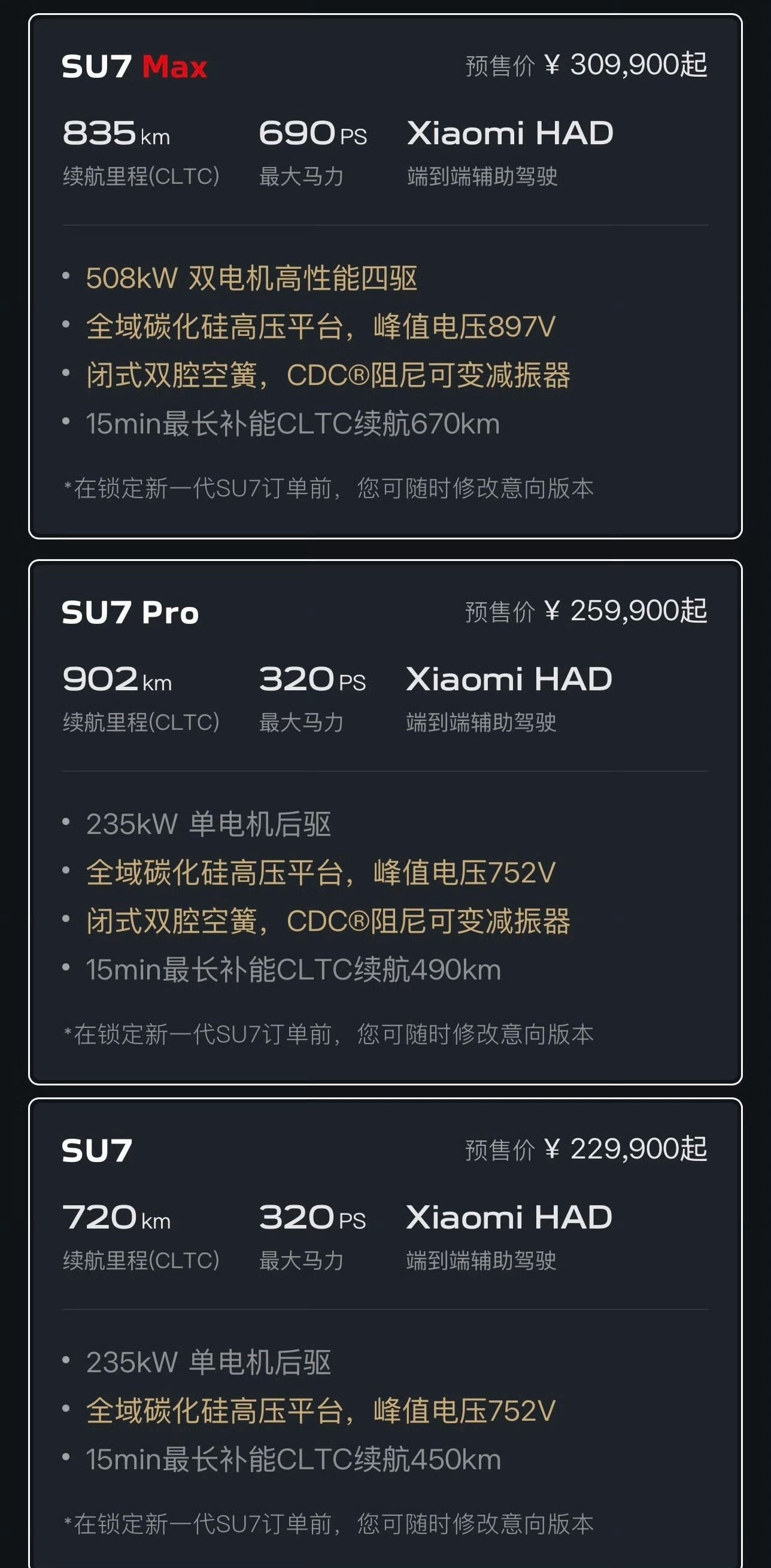 雷军官宣新一代SU7全系标配800V高压平台及5C超充,CLTC续航最高到902km,全系标配激光雷达,雷神U芯片和城市NOA功能,全系标配四座通风/加热/按摩,隐藏门把手新增机械冗余设计,预售价22.99万起。 新一代SU7价格